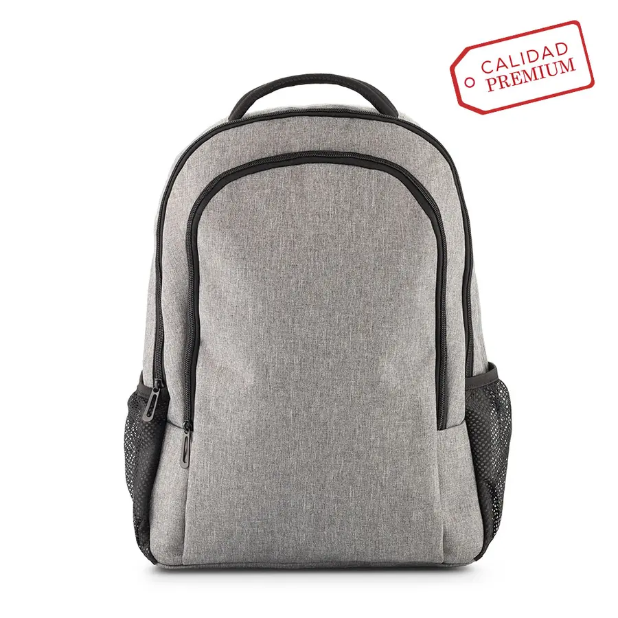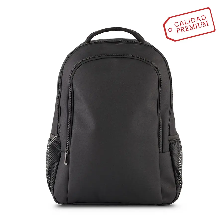 Morral backpack en poliéster. Apto para portátil de hasta 15″. Dos bolsillos externos con cremallera. Dos bolsillos laterales en malla. Banda posterior para enganchar en trolley.