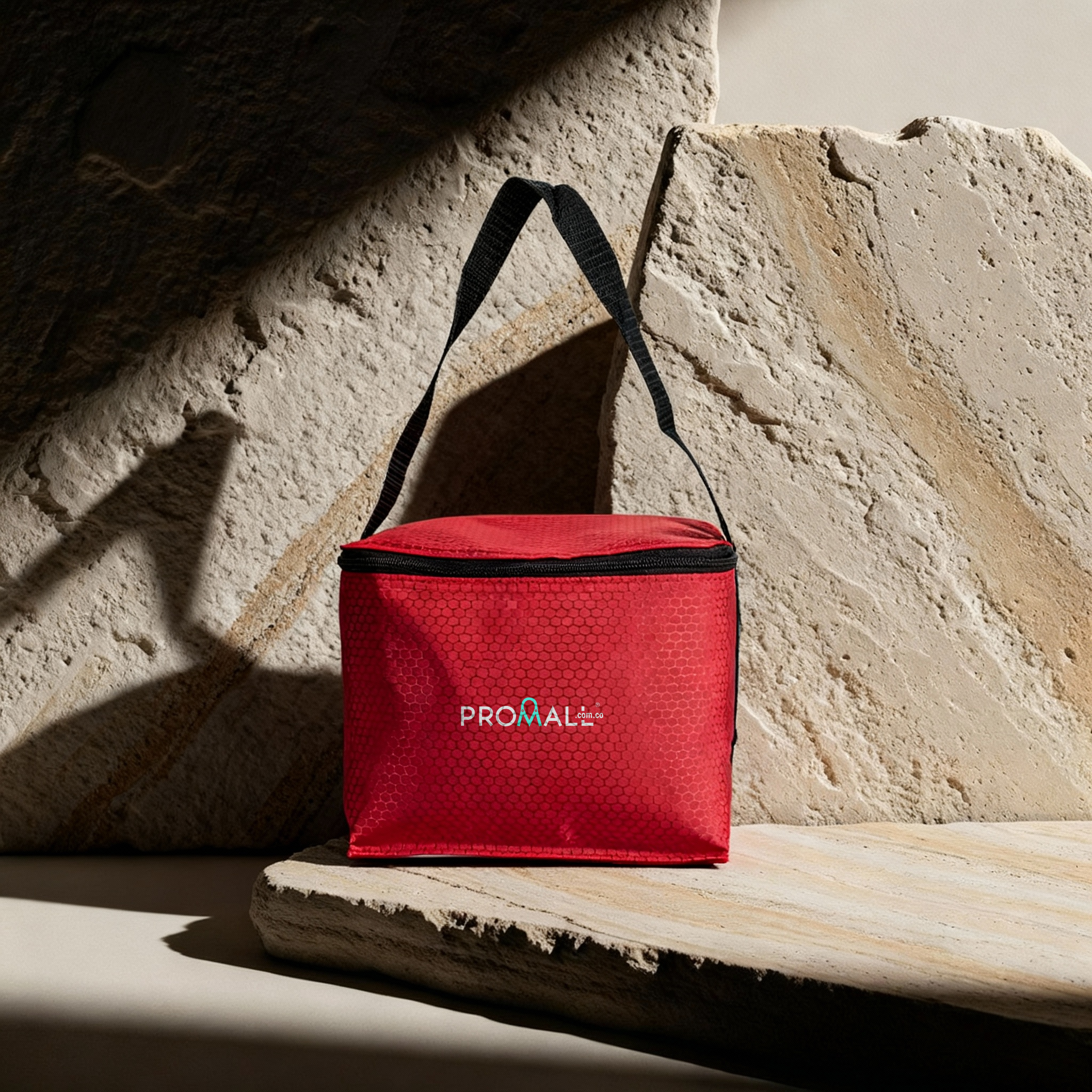 Morral en poliéster 610D, bolsillo frontal con cremallera y dos mallas laterales.