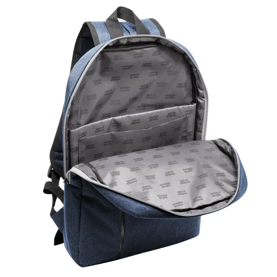 30 x 44 x 8 cm. Capacidad 11 litros. Poliéster 300D . Morral Portanotebook hasta 16′. Compartimento principal con cierre y bolsillo frontal con cierre lateral y detalle de costura vertical. En el interior posee un compartimento acolchado para notebook y un bolsillo adicional para tablet. Tiradores de cierre engomados. Presencia de marca en su interior y en una de sus correas.