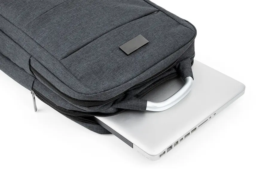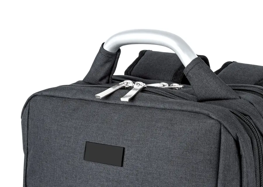 Morral con agarradera en Aluminio y cargaderas ajustables, un compartimento con velcro para portátil de hasta de 14 y el otro con bolsillo interior para bolígrafo y libreta. Doble Bolsillo frontal con cierre de cremallera. Incluye placa metálica para marcar láser.