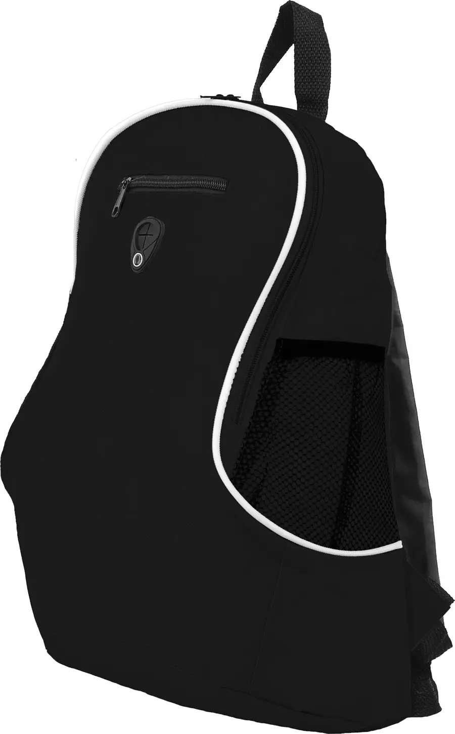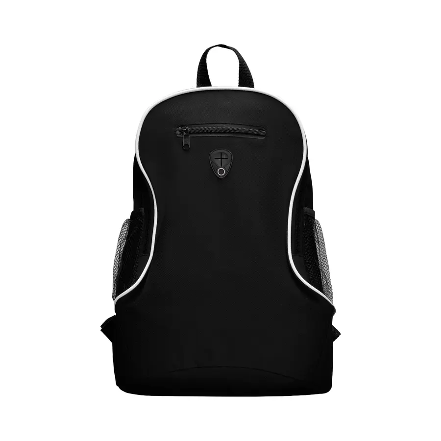40 x 29 x 17,5 cm. Capacidad 16 litros. Aprox. Poliéster 600D. Compartimento principal con bolsillo frontal con cierre. Dos bolsillos laterales de red porta bebidas. Correas ajustables. Cierres metálicos. Salida para audífonos.