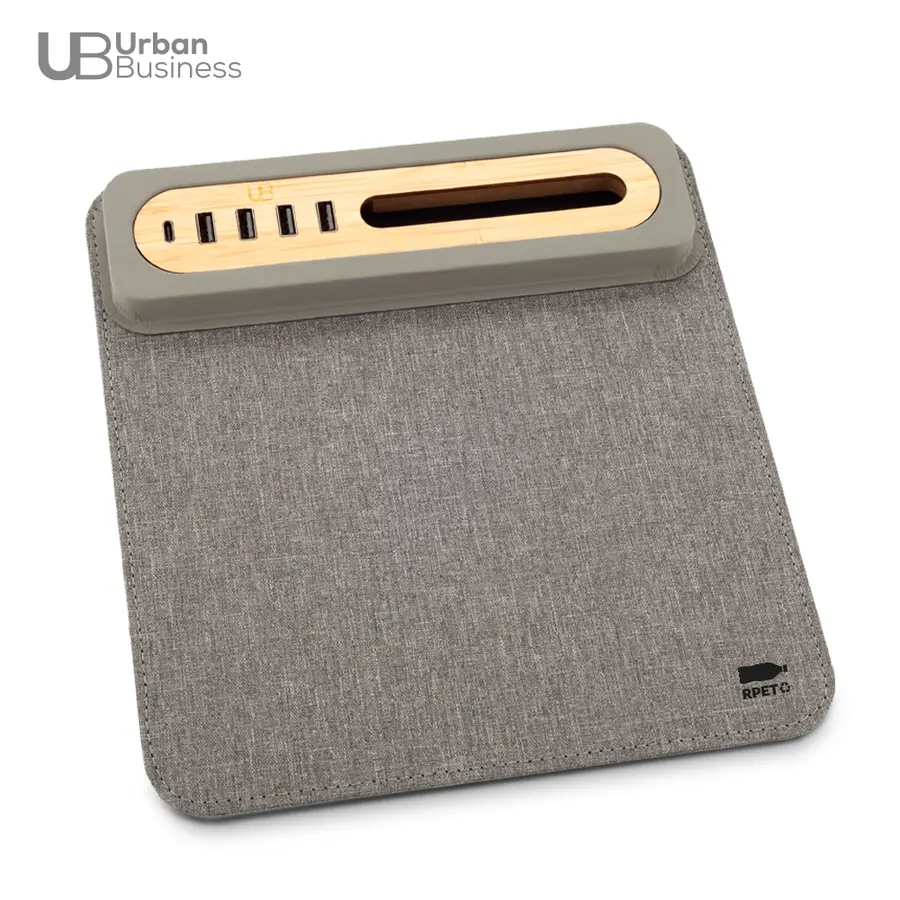 Mouse pad en poliéster reciclado RPET. Cuatro puertos Tipo USB, un puerto Tipo C y soporte para el celular en bambú. Empaque caja individual.