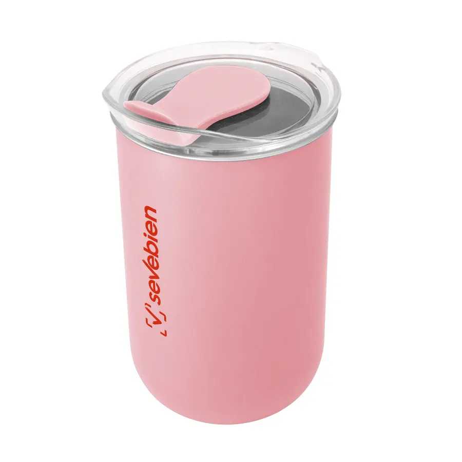 Elegancia y Aislamiento en MovimientoMug doble Pared. Interior de acero inoxidable 304 y exterior de polipropileno. Pintura acabado mate. Tapa plástica transparente a presión con anillo de silicona y cierre de silicona a tono con el color del cuerpo. Medidas: Ø 7,7 x 13 cm. Capacidad: 350 ml. Materiales: Acero inoxidable, silicona, polipropileno y poliestireno. Presentación: en caja de regalo kraft.