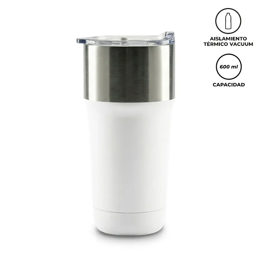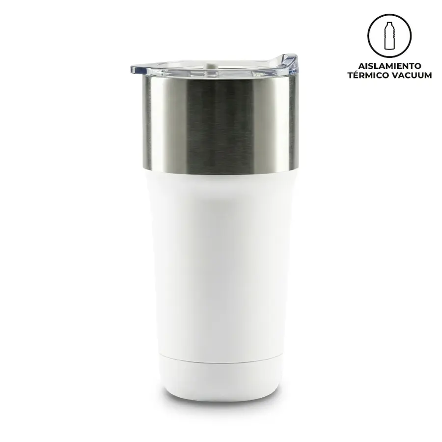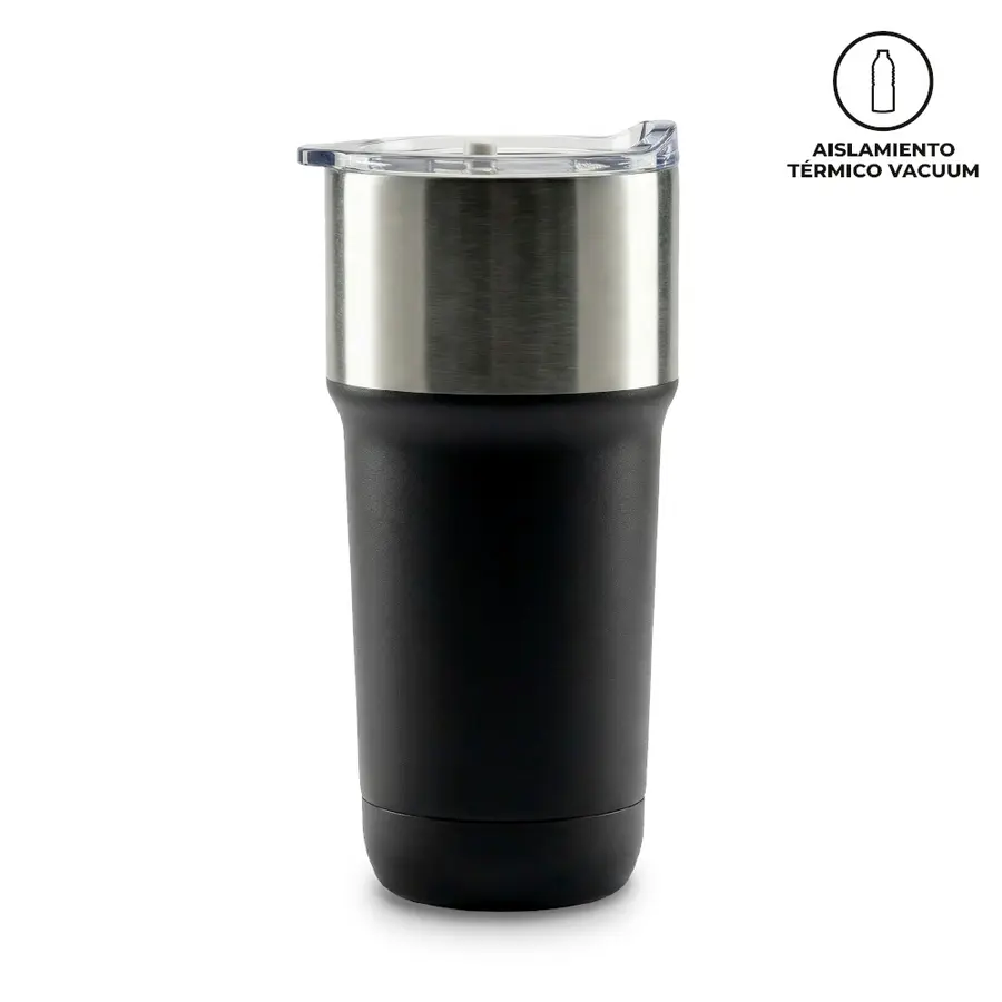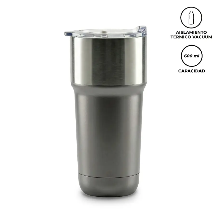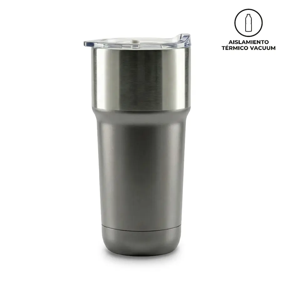 Mug metálico doble pared vacuum en acero inoxidable, con aislamiento térmico que mantiene la bebida fría o caliente hasta 6h aprox (puede variar dependiendo condiciones climáticas).La tapa es una tapa protectora de cierre a presión, no es tapa de seguridad. Empaque caja individual.