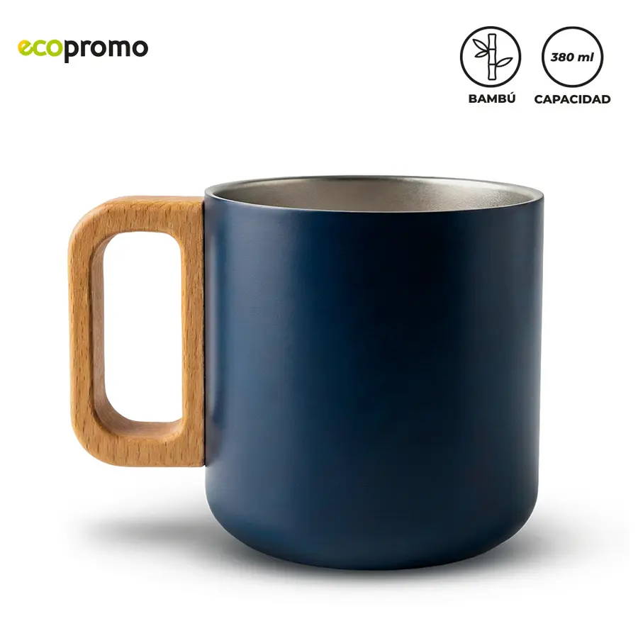 Mug en acero inoxidable doble pared con manija en bambú, el material de fabricación es de textura porosa. Empaque caja individual.