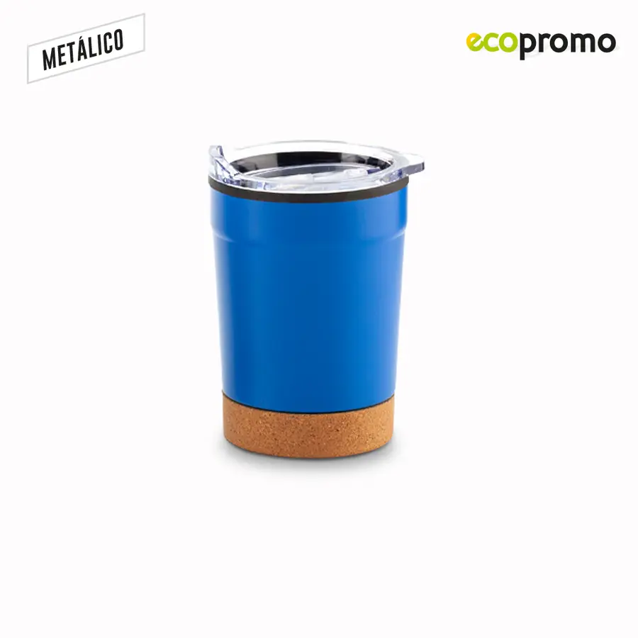 Mug metálico en acero inoxidable doble pared con interior plástico y base en corcho. La tapa es una tapa protectora de cierre a presión, no es de seguridad. Empaque caja individual.