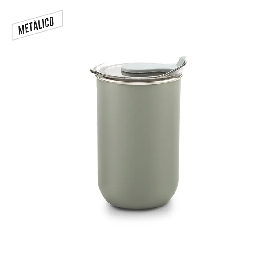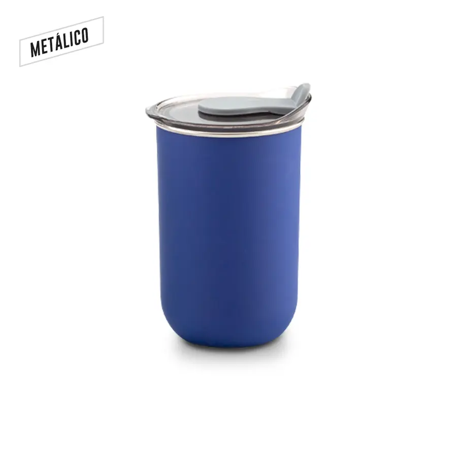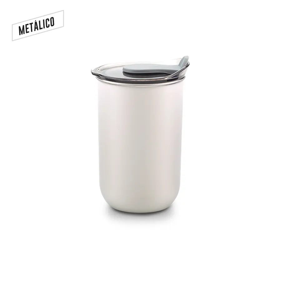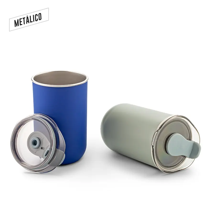 Mug metálico en acero inoxidable. La tapa es una tapa protectora de cierre a presión, no es una tapa de seguridad. Empaque caja individual.