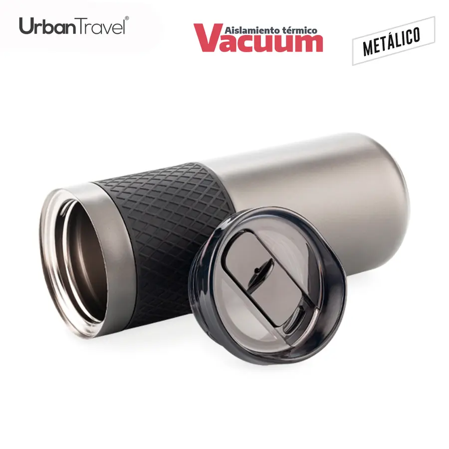 Mug doble pared vacuum en acero inoxidable, con aislamiento térmico que mantiene la bebida fría o caliente hasta 6h, aprox (puede variar dependiendo condiciones climáticas). Con tapa rosca plástica y grip en silicona. Empaque caja individual.
