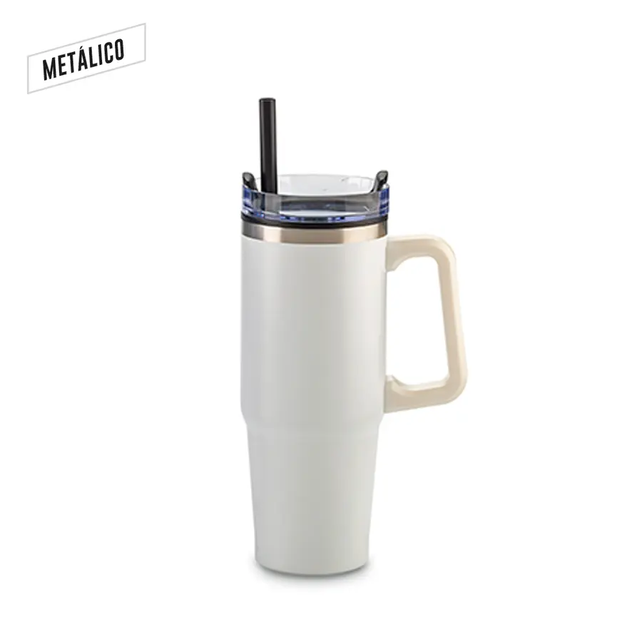 Mug metálico en acero inoxidable doble pared con interior plástico y tapa. Incluye pitillo. La tapa es una tapa protectora de cierre a presión, no es una tapa de seguridad. Empaque caja individual.