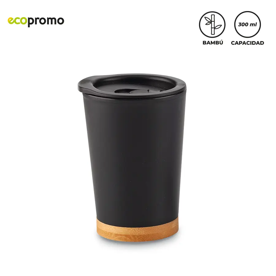 Mug plástico doble pared con base en bambú.