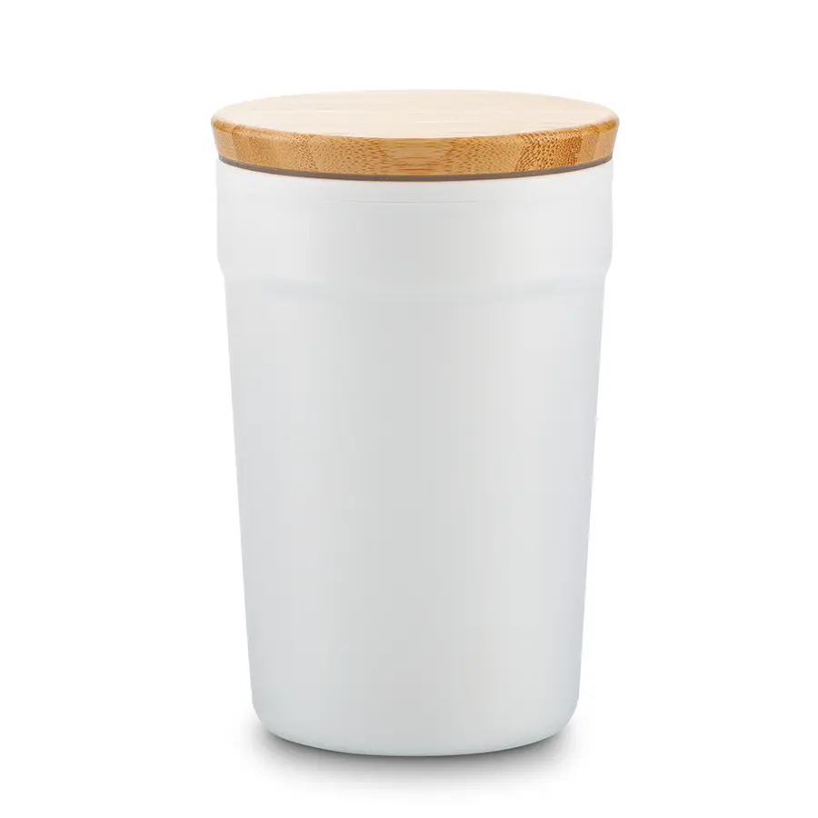 Mug plástico doble pared con tapa de cierre a presión en bambú. La tapa es una tapa protectora de cierre a presión, no es tapa de seguridad. Empaque caja individual.