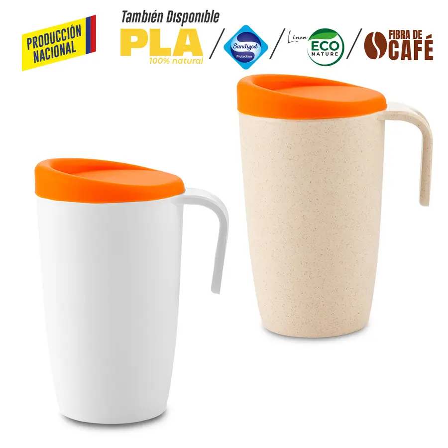 Mug plástico en polipropileno producción nacional. Opcional solo polipropileno o con material ecológico de fibra de trigo. Mezcla con material ecológico en fibra de trigo (50%-60% aprox). El porcentaje de material ecológico tiene un promedio de biodegradabilidad de 2-3 años después del fin de su vida útil. Tapa en silicona importada. La tapa es una tapa protectora de cierre a presión, no es tapa de seguridad.