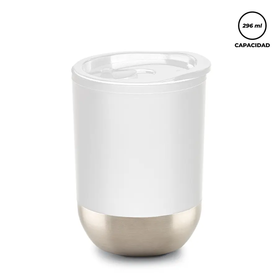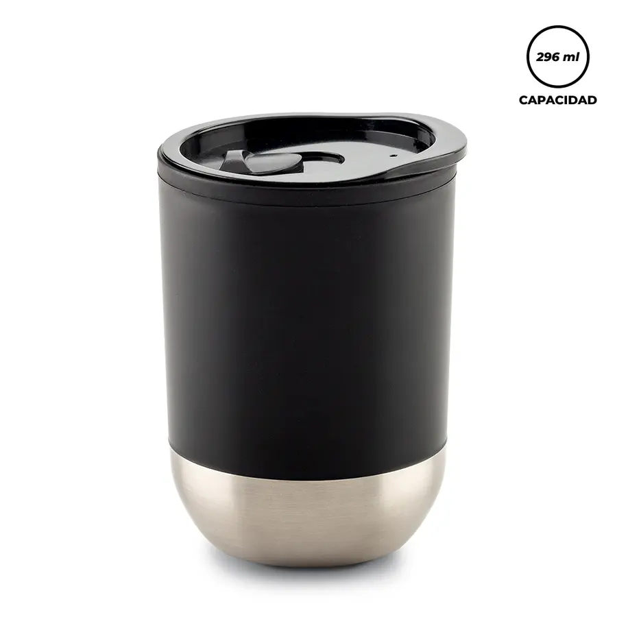 Mug plástico doble pared con interior plástico, exterior en acero inoxidable y tapa (la tapa es una tapa protectora de cierre a presión, no es tapa de seguridad). Empaque caja Individual.