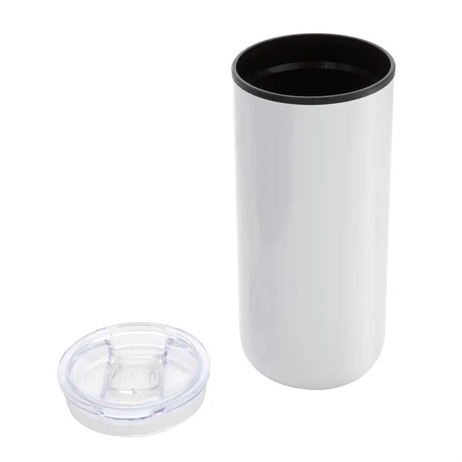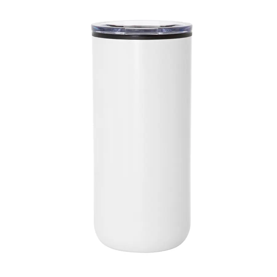 Manten tus bebidas a la temperatura perfecta, con estilo y sin derrames.Mug doble pared. Interior en plástico y exterior de acero inoxidable 201. Tapa plástica transparente a presión con anillo de silicona. Base antideslizante. Medidas: Ø 8 cm x 17.6 cm. Capacidad: 500 ml. Materiales: Polipropileno y acero inoxidable. Presentación: en caja de regalo Kraft.