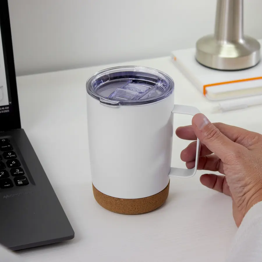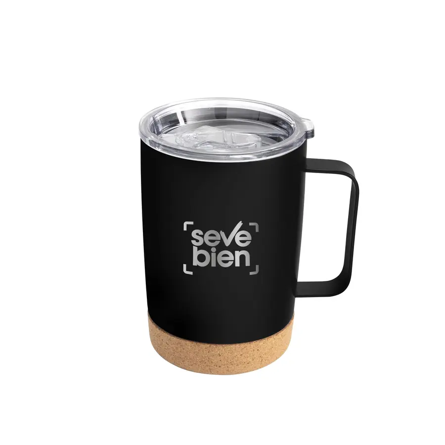 Diseño elegante con base de corcho.Mug doble pared con asa, sellado al vacío. Mug con aislamiento térmico. Tecnología vacuum. Interior en acero 304 y exterior en acero 201. Tapa de poliestireno con anillo de silicona. Asa metálica. Base de corcho. Pintura acabado semi mate. Mantiene hasta 12 hs la temperatura de las bebidas calientes y 24 hs de las bebidas frías.Medidas: Ø 8,5 cm x 13 cm. (no incluye asa) Capacidad: 350 ml. Materiales: Acero inoxidable, poliestireno y corcho. Presentación: en caja de regalo Kraft.