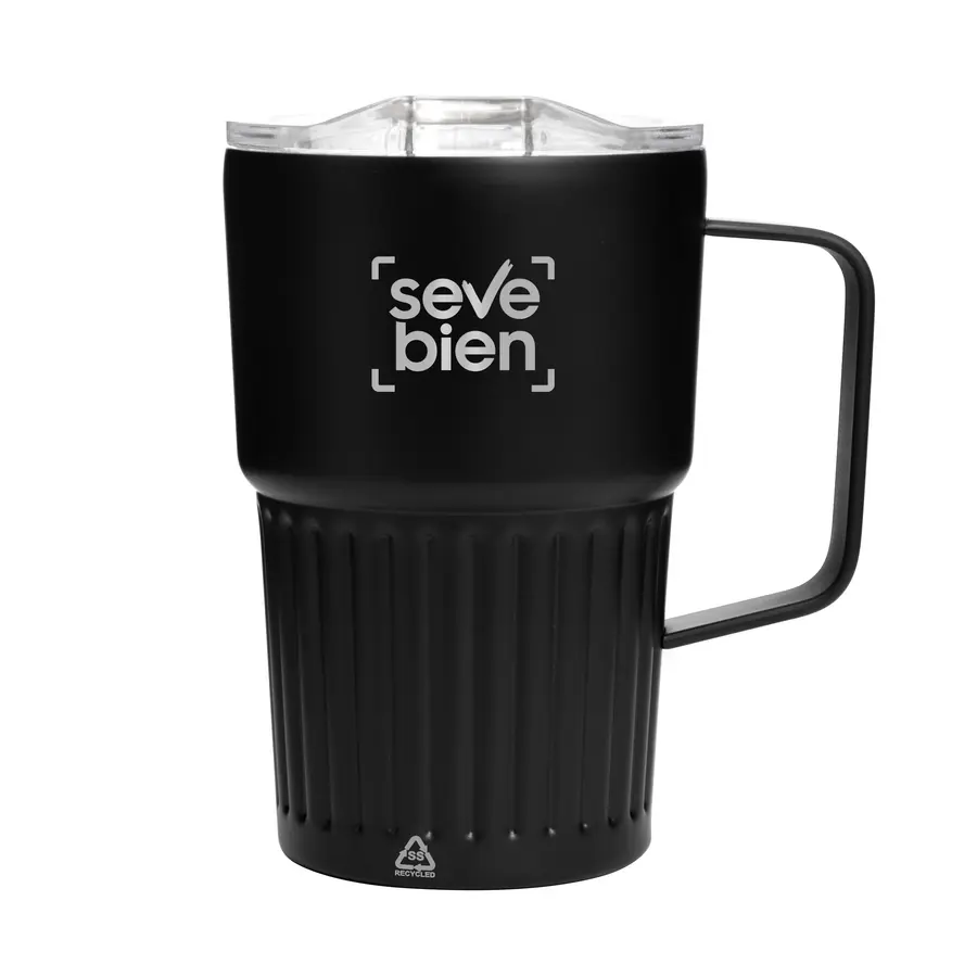 Diseño texturado para mejor agarre.Mug doble pared con asa, sellado al vacío. Mug con aislamiento térmico. Tecnología vacuum. Interior en acero 304 reciclado y exterior en acero 201. Tapa de poliestireno con anillo de silicona. Asa metálica. Pintura acabado semi mate. Parte inferior texturada. Mantiene hasta 12 hs la temperatura de las bebidas calientes y 24 hs de las bebidas frías.Medidas: Ø 8,7 cm x 14 cm. (no incluye asa) Capacidad: 450 ml. Materiales: Acero inoxidable, acero inoxidable reciclado y poliestireno. Presentación: en caja de regalo Kraft.