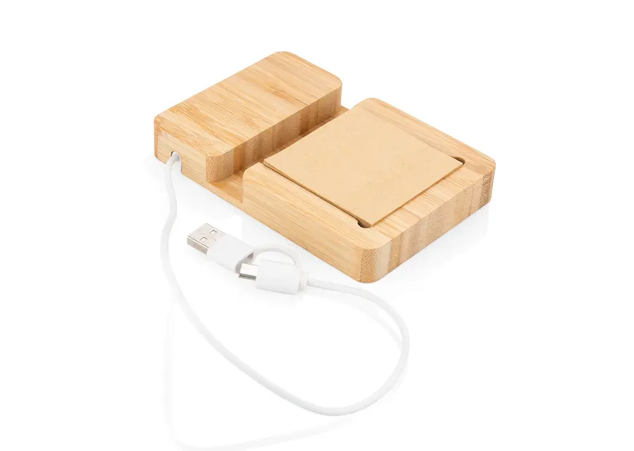 Multipuerto de bambú con soporte para teléfono y notas adhesivas. 2 entradas Tipo C, 2 entradas USB. 1 salida tipo C o USB.