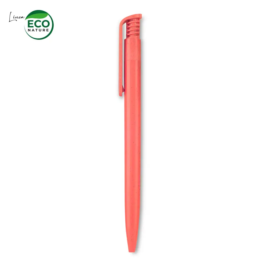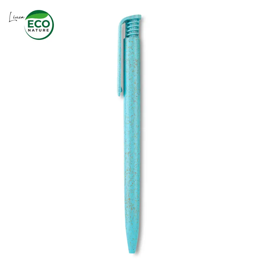 Bolígrafo plástico. Mecanismo push. Mezcla con material ecológico en fibra de trigo (50%-60% aprox). El porcentaje de material ecológico tiene un promedio de biodegradabilidad de 2-3 años después del fin de su vida útil.