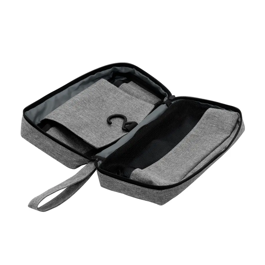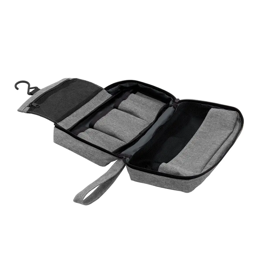 Organiza tu viaje con estilo Y practicidad.Necessaire colgante. Compartimento principal con cierre y asa de tela para transportar. Interior: compartimento superior rebatible con gancho para colgar y bolsillo de red con cierre, compartimento central con 3 bolsillos y amplio compartimento inferior con ventana de red y cierre. Medidas: 25 x 7,5 x 13 cm (cerrado) y 25 x 7,5 x 51 cm (abierto). Materiales: Poliester 300D.