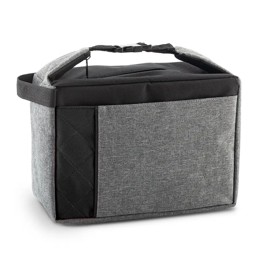 Nevera en poliéster con recubrimiento interior en PVC que conserva las bebidas o alimentos fríos por más tiempo. Broche de cierre y manija lateral para cargar.