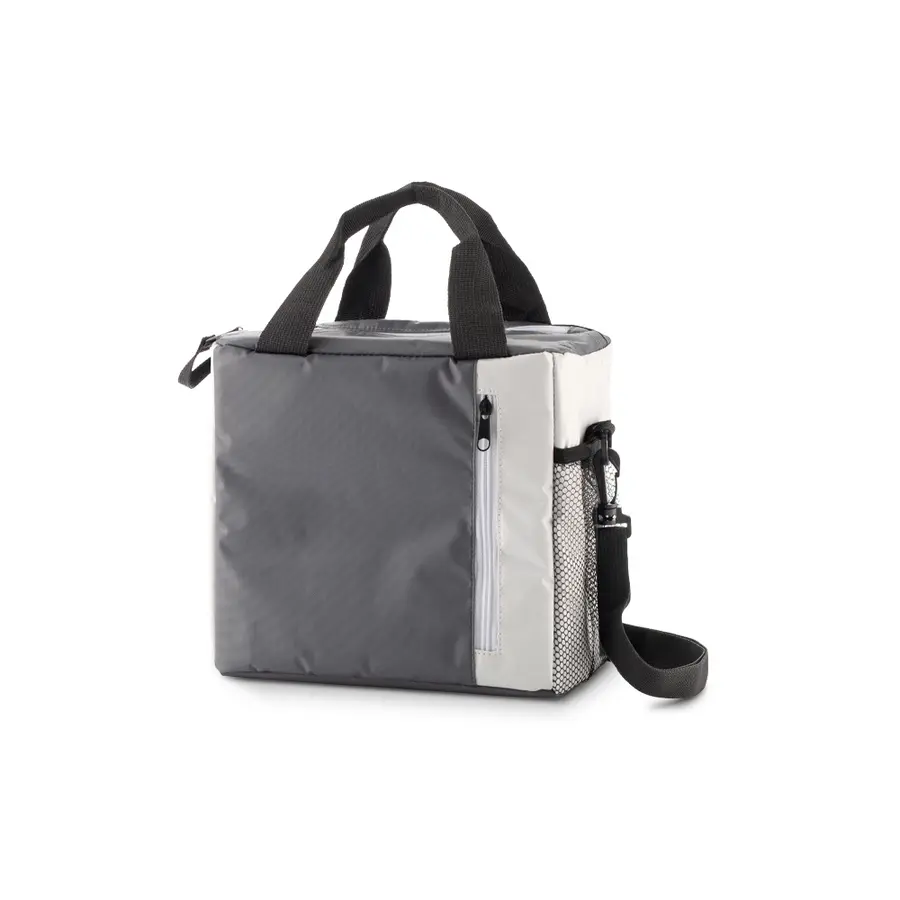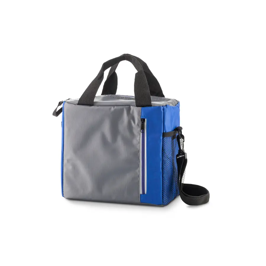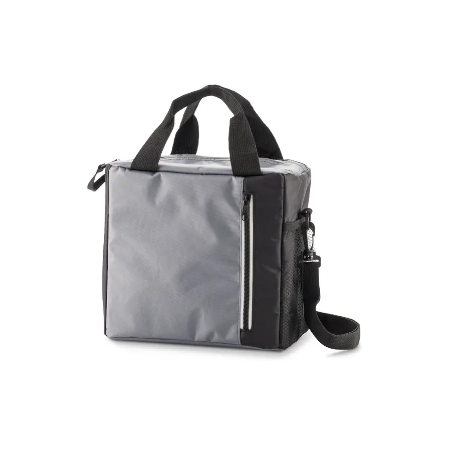 Nevera en poliéster con interior en PVC y cierre en cremallera. Un bolsillo externo con cremallera. Un bolsillo lateral en malla.