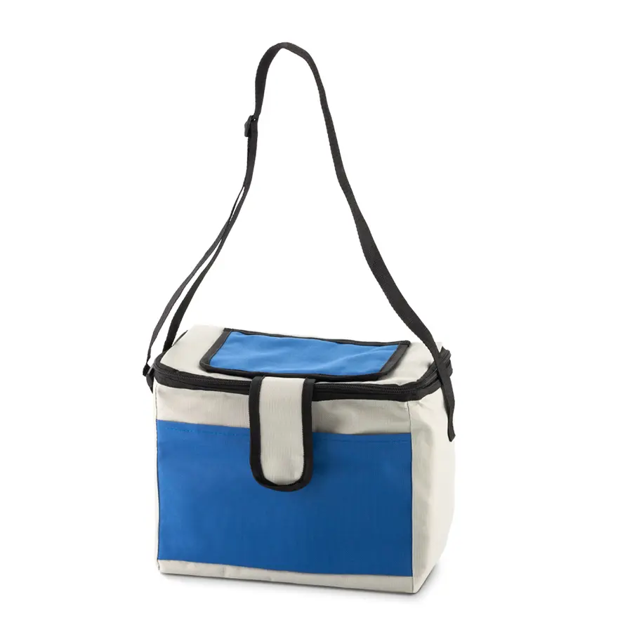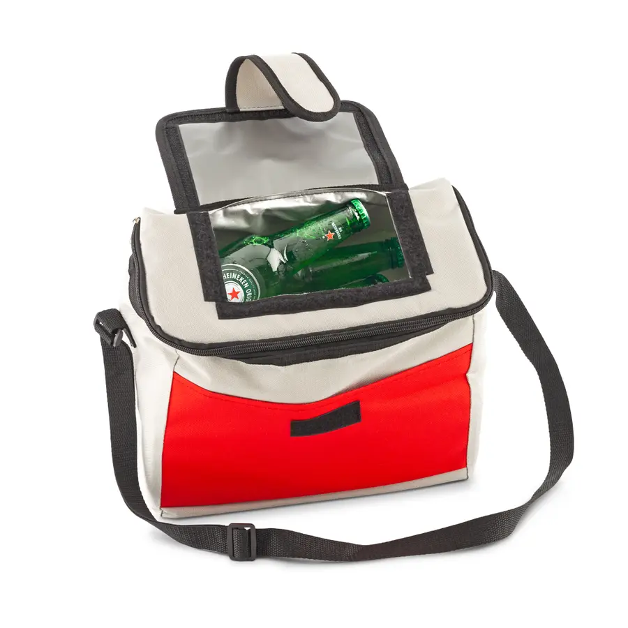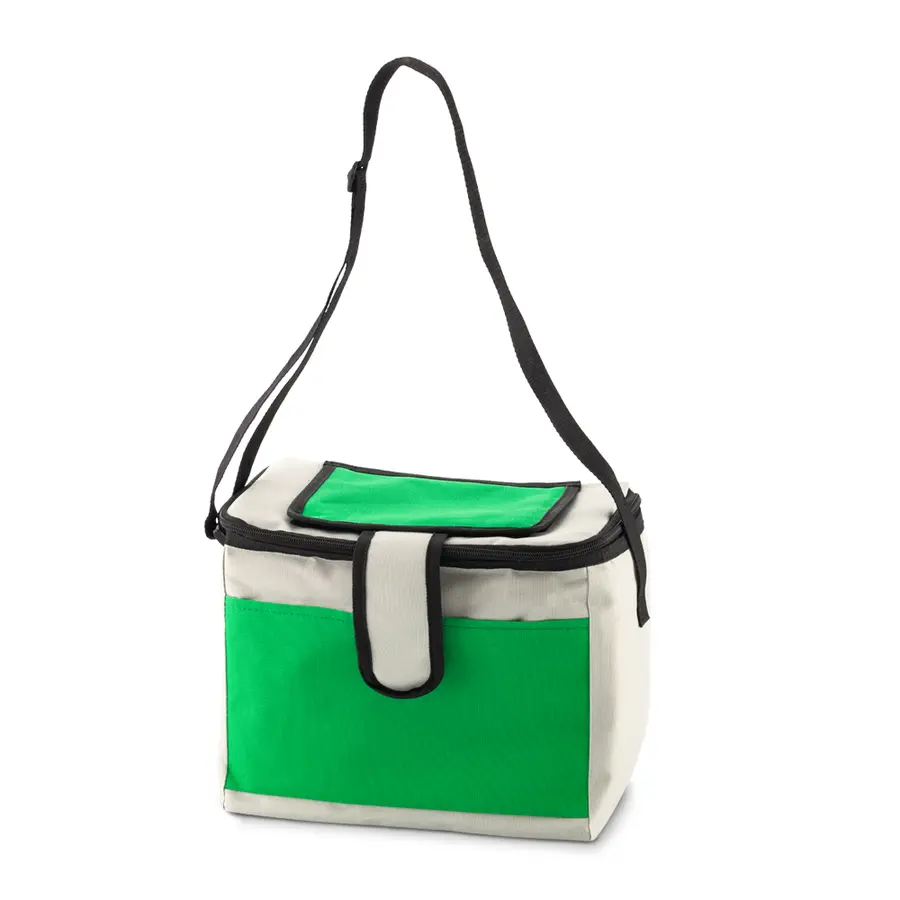 Nevera en poliéster con interior en PVC. Un bolsillo externo sin cierre. Un bolsillo externo con cremallera y tapa con velcro para agilidad y comodidad de sacar los productos.