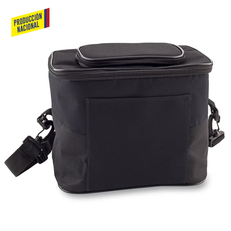 En poliéster con bolsillo frontal y recubrimiento interior que conserva las bebidas o alimentos fríos por más tiempo. Parte superior con cremallera para fácil acceso al interior. Correa ajustable para cargar.