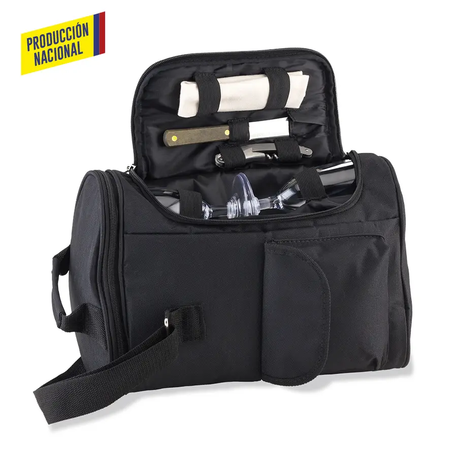 Nevera en lona poliéster con bolsillos laterales. Incluye dos copas plásticas, destapador, servilletas y cuchillo.