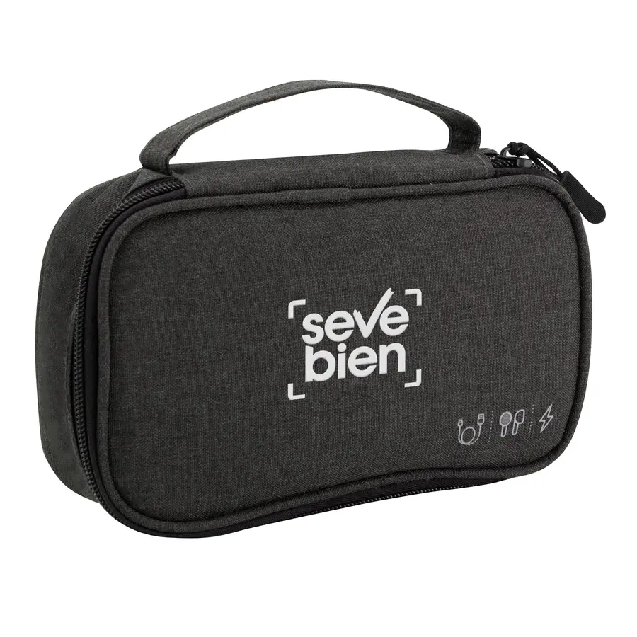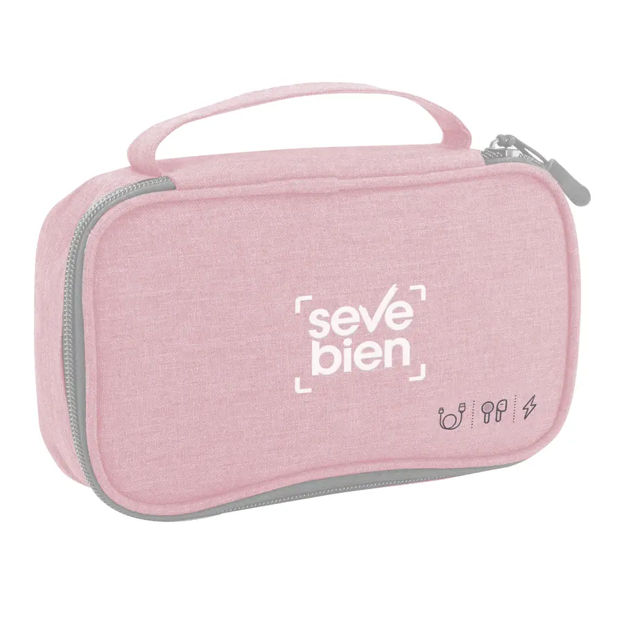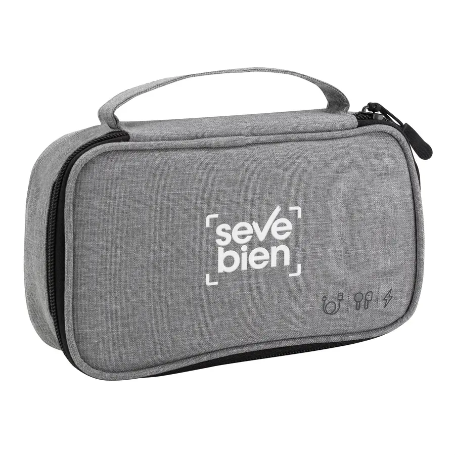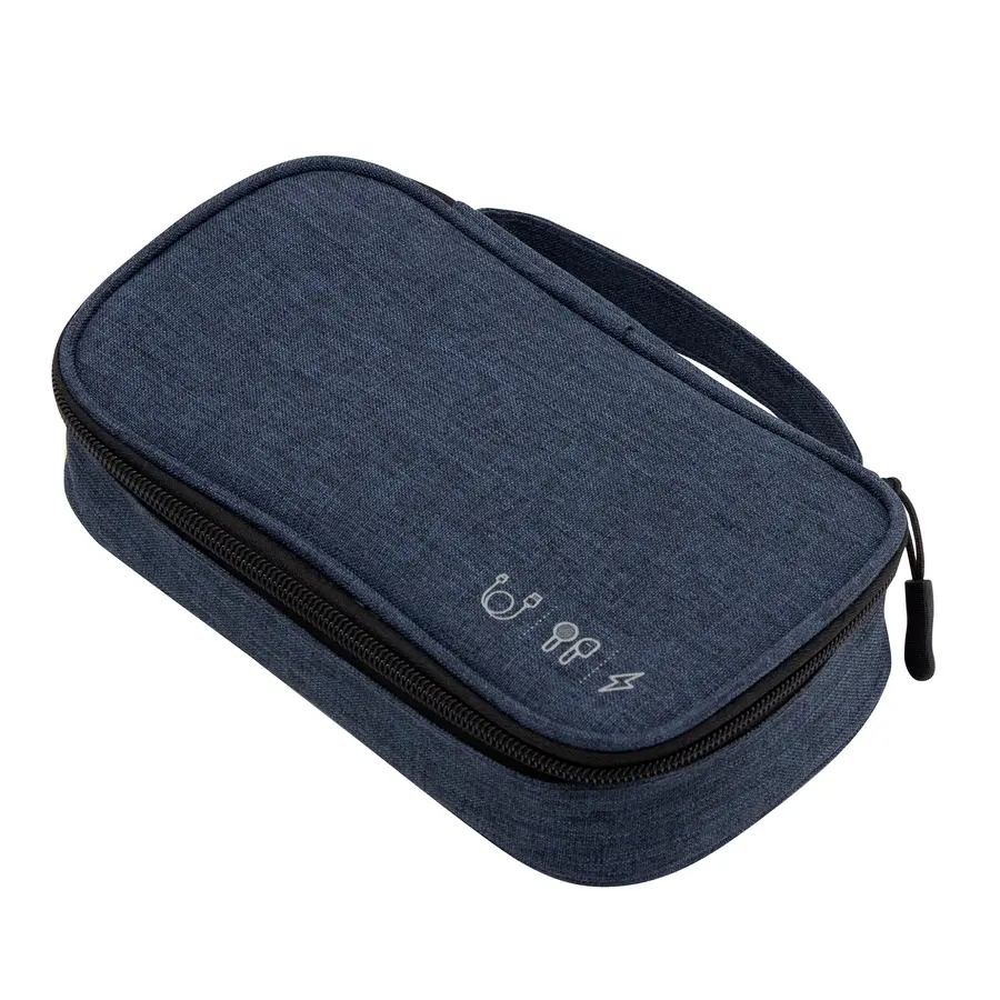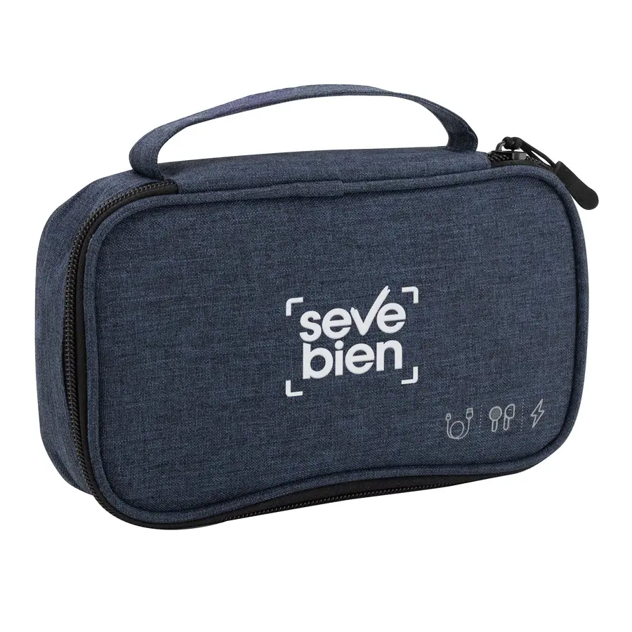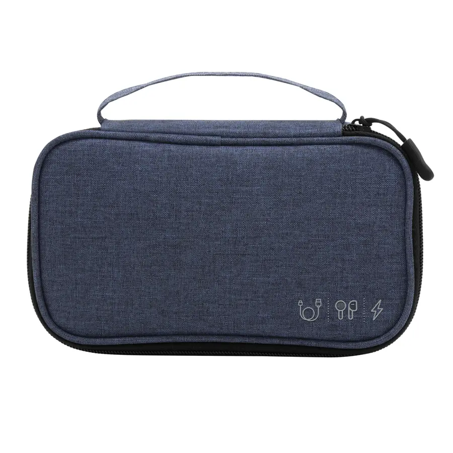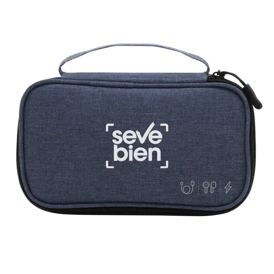 Organizador de cables. Estructura acolchada. Asa para transportar. Compartimento principal con cierre con tirador engomado. Interior forrado. En uno de sus lados cuenta con un bolsillo principal y dos pequeños de red, y en el lado contrario tiene un elástico con velcro multipropósito. Poliéster 300D.