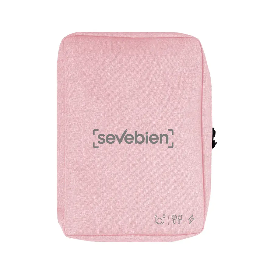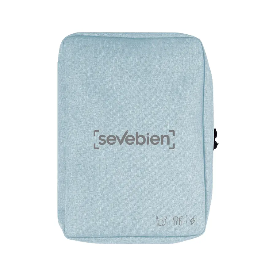 26 x 19 x 5 cm. Poliéster. Organizador para cables y accesorios. Cuenta con dos bolsillos de red con cierre. 4 elásticos que permiten arrollar y guardar los cables, 1 elástico porta bolígrafo y 2 elásticos amplios. NO INCLUYE ACCESORIOS.