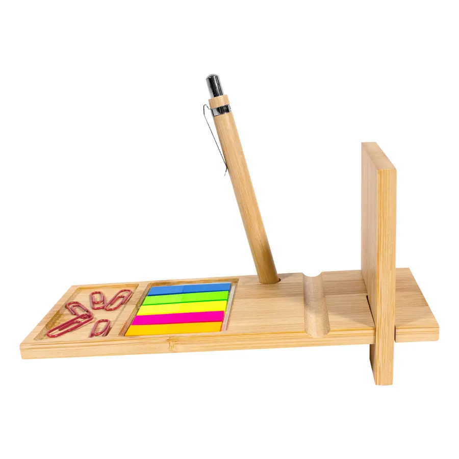 19,5 x 8,5 x 0,7 cm. y 10 x 8,5 x 0,7 cm. Bambú. Organizador de escritorio compuesto por dos piezas engranables con compartimentos para accesorios y ranuras porta boligrafo y porta celular. Parte posterior también funciona como soporte porta celular. Incluye bolígrafo (cuerpo de bambú, pulsador, clip y detalles metálicos, tinta negra), set de 5 señaladores autoadhesivos de diferentes colores y clips en color rojo. Ideal para acompañar tus tareas tanto en la oficina como home office. PRESENTADO EN CAJA DE REGALO.