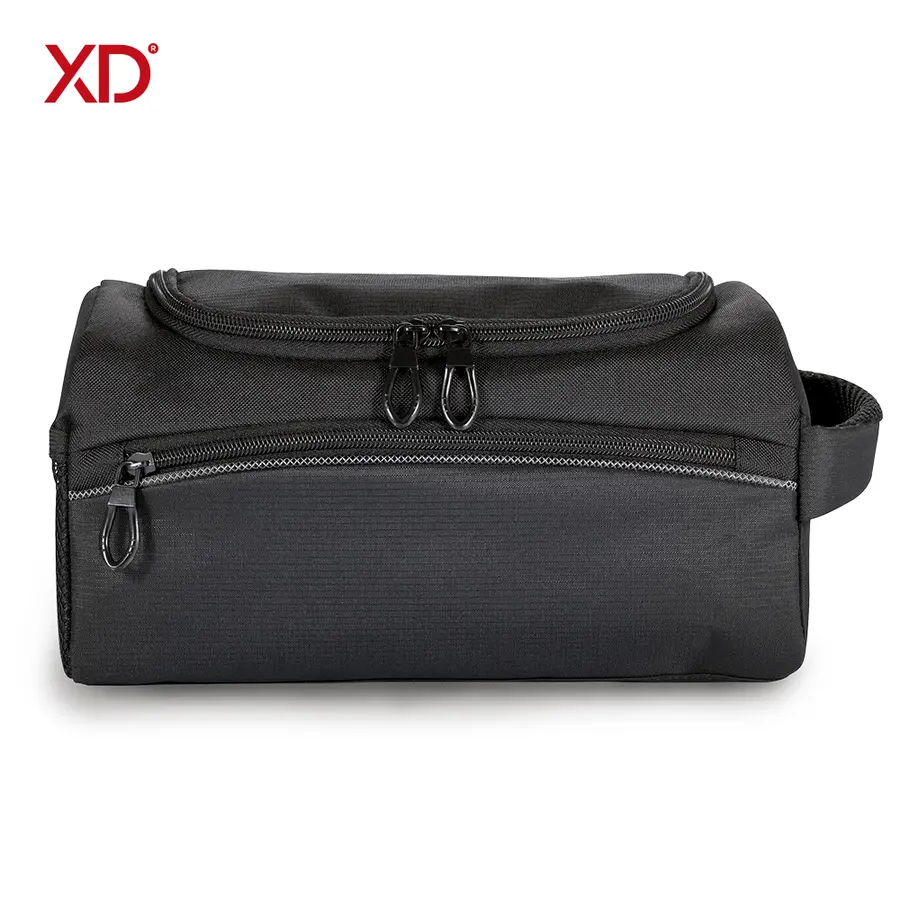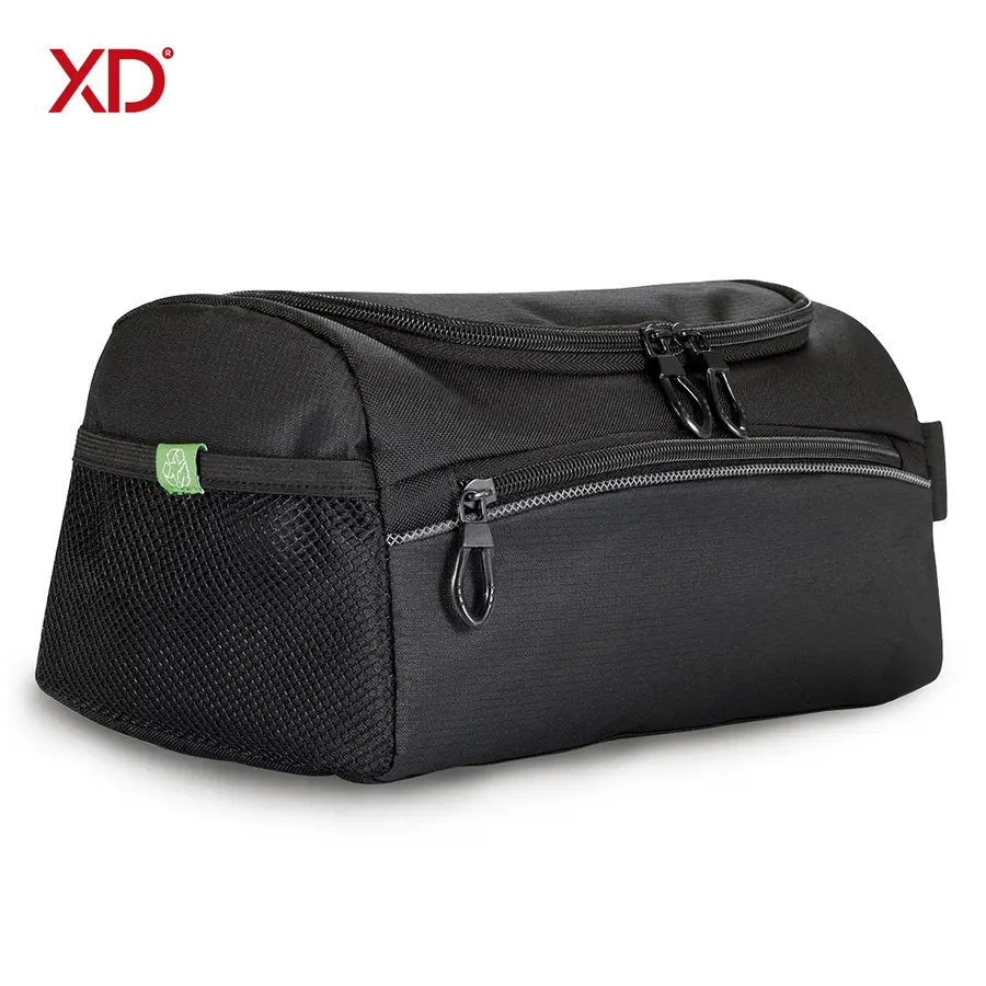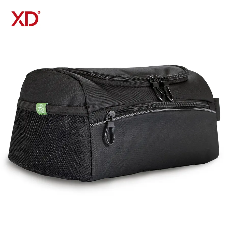 cremallera, bolsillo en malla y gancho metálico para colgar.
