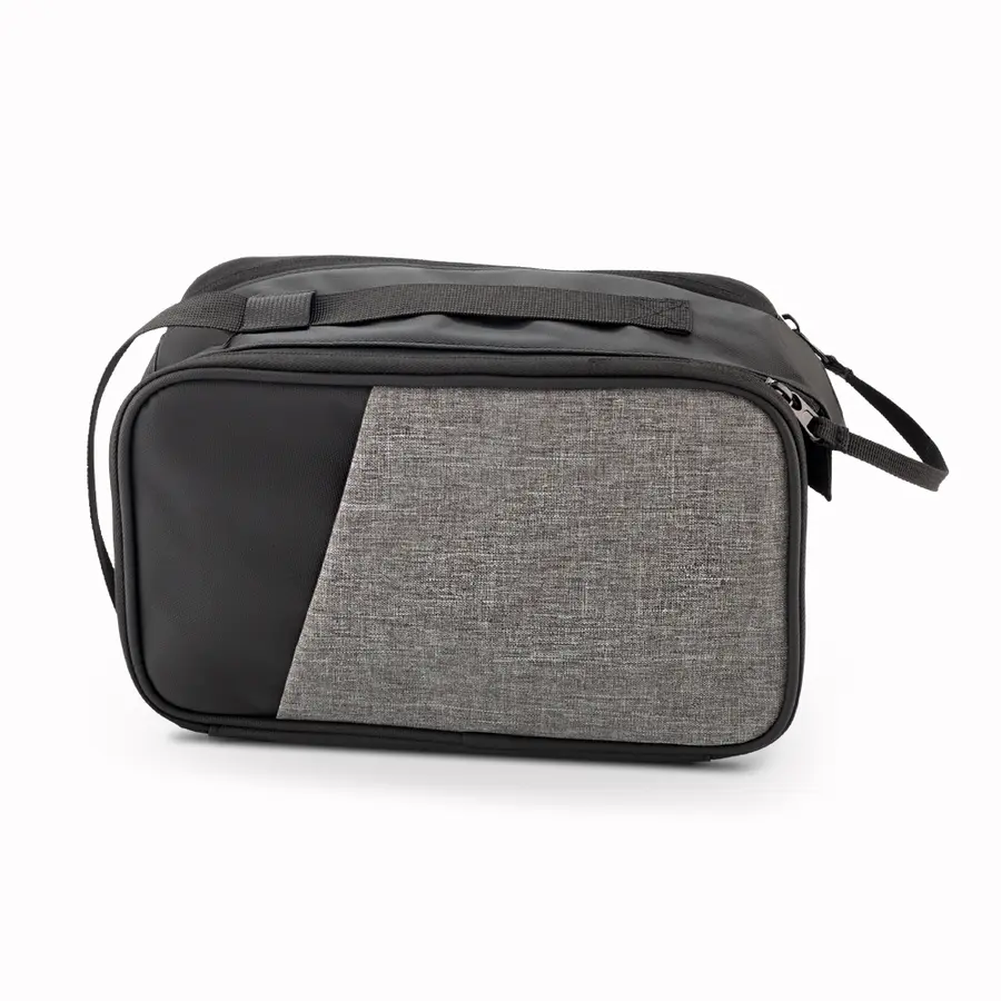 En poliéster, bolsillo externo sin cremallera y agarradera lateral.