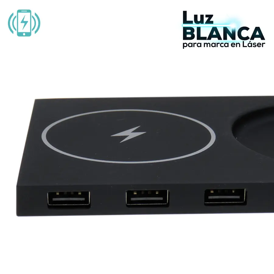 Cargador inalámbrico plástico. Con bandeja organizadora para escritorio que tiene un área con luz que ilumina el logo al marcar en láser. 3 puertos USB.