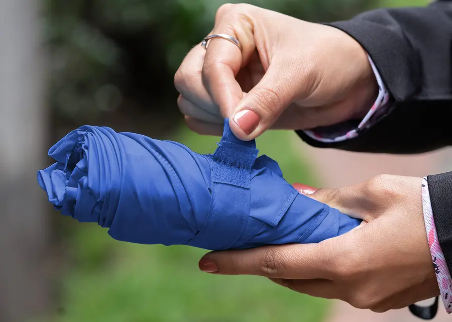 Paraguas mini, perfecto para transportar fácilmente en maletas o bolsos; reversible, de una sección, con apertura y cierre manuales. Marco en fibra de vidrio, de color negro, y mango plástico en juego con el color de la tela. Incluye estuche negro en EVA con cremallera del mismo color del paraguas.