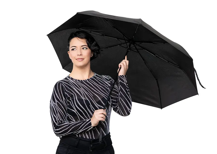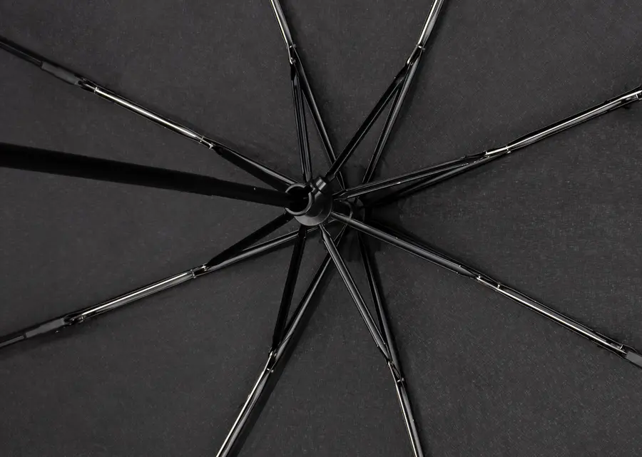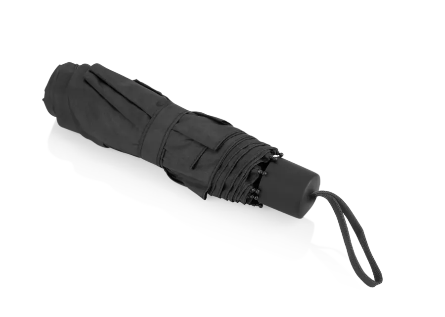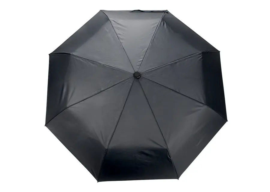 Paraguas plegable de 21 pulgadas con 8 cascos en 3 secciones, apertura y cierre manual completo. Su estructura combina marco chapado negro con 2 secciones de fibra de vidrio, ofreciendo resistencia y flexibilidad. Con tela pongee 190T, cada unidad incluye una bolsa de compras (29,8 X 35 X 11) del mismo material, también a prueba de viento, diseñada para llevar el paraguas junto al bolsillo. El mango es de plástico PP con acabado de goma, cómodo y en colores coordinados.