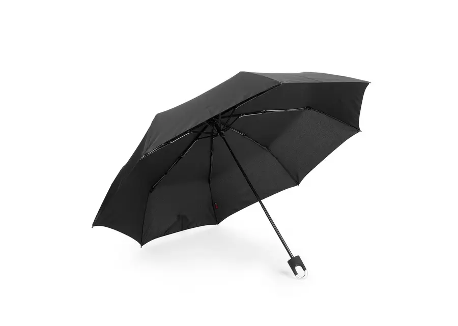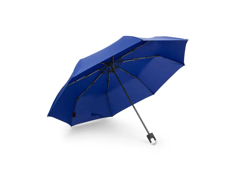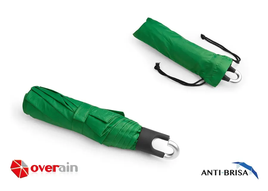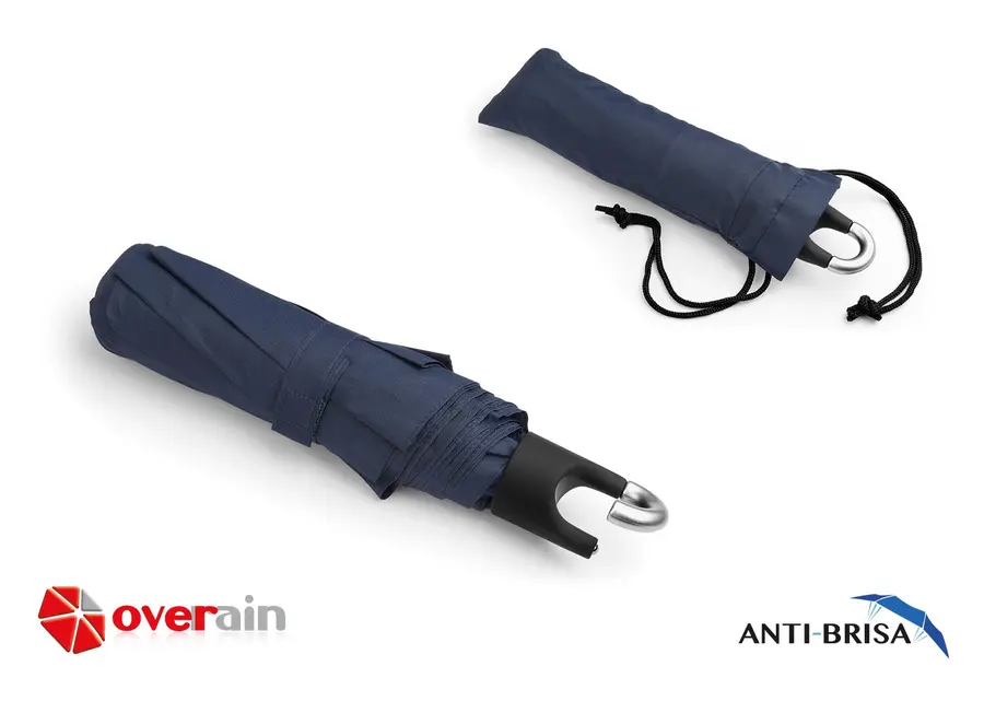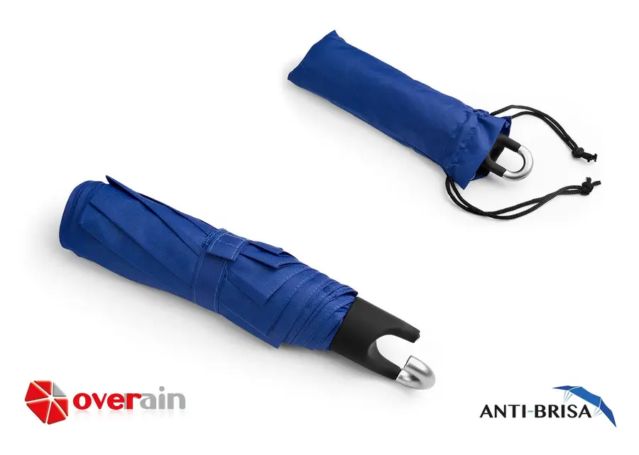 Paraguas 21 pulgadas x 8 cascos, 3 secciones con cierre manual y tecnología windproof que lo hace resistente al viento. Antibrisa. Costillas en fibra de vidrio. Mango plástico con gancho para transportar fácilmente. Incluye funda.
