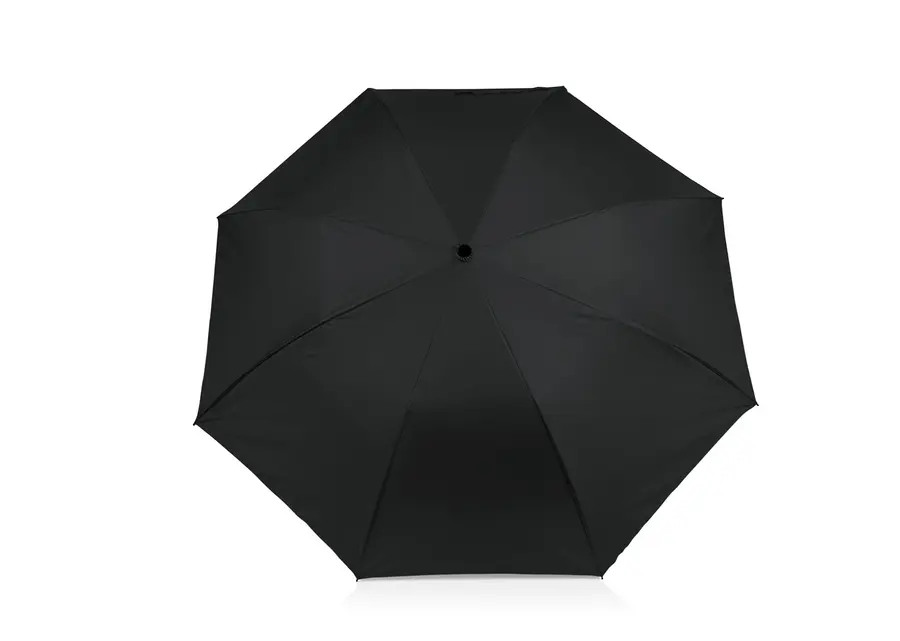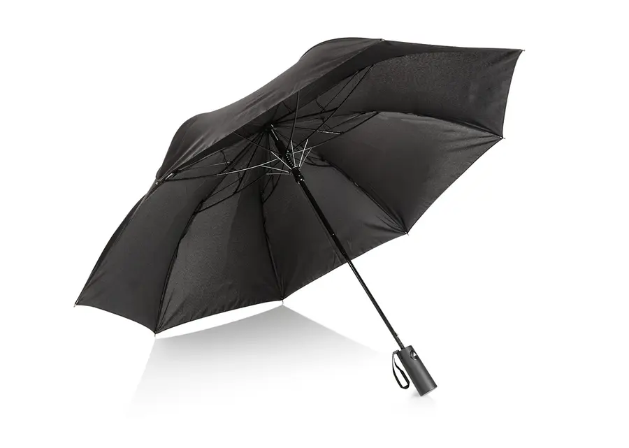 Paraguas de 2 secciones, con apertura automática y cierre manual. Su marco es de metal en color negro. Funda del mismo color que el paraguas.