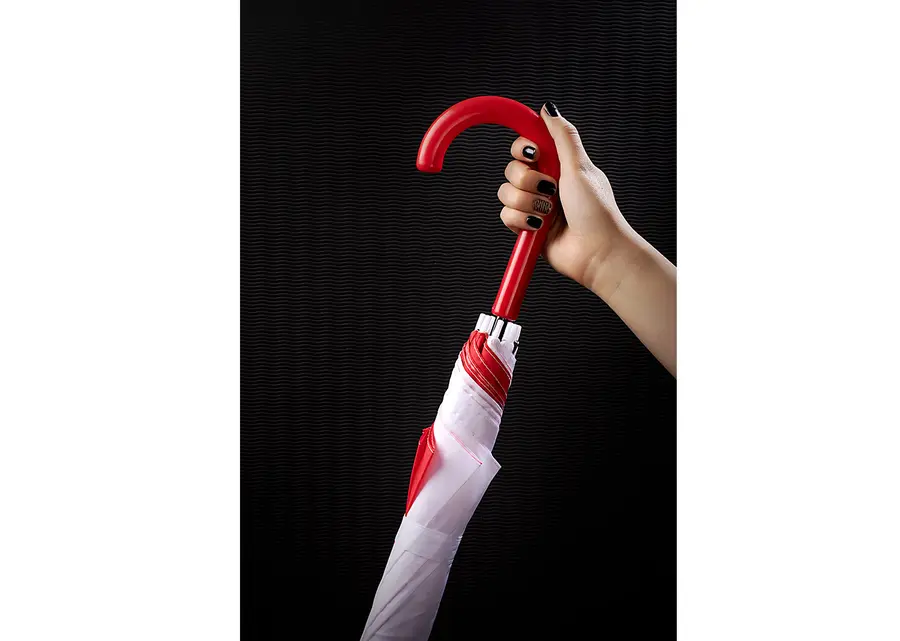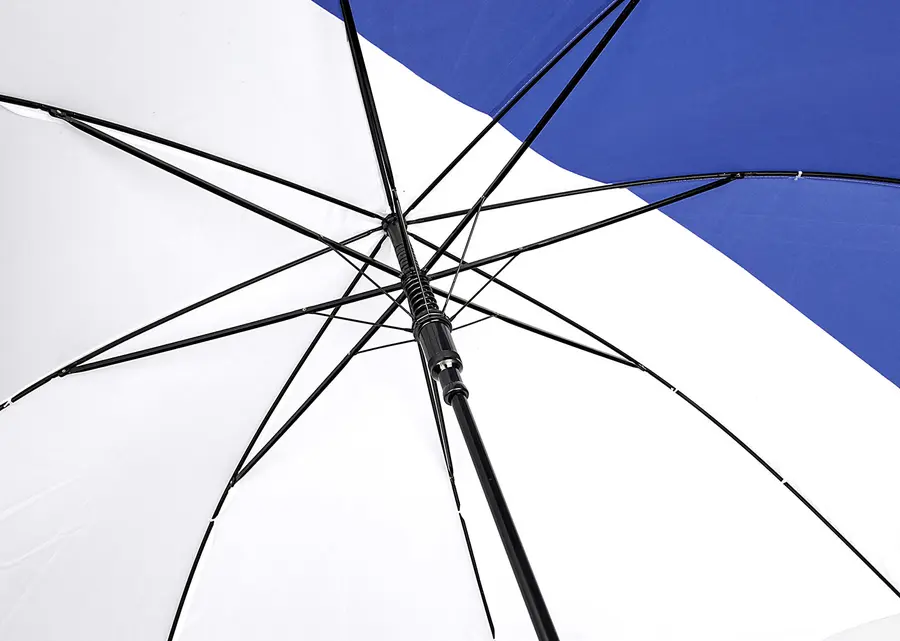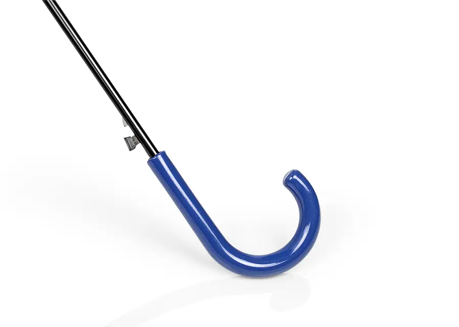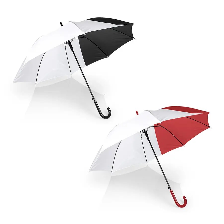 Paraguas de 23» sistema de apertura automática y cierre manual, 8 cascos, varilla metálica con recubrimiento negro, 190t tela pongee. Mago curvo plástico en PP curvo a juego con el color de la tela.