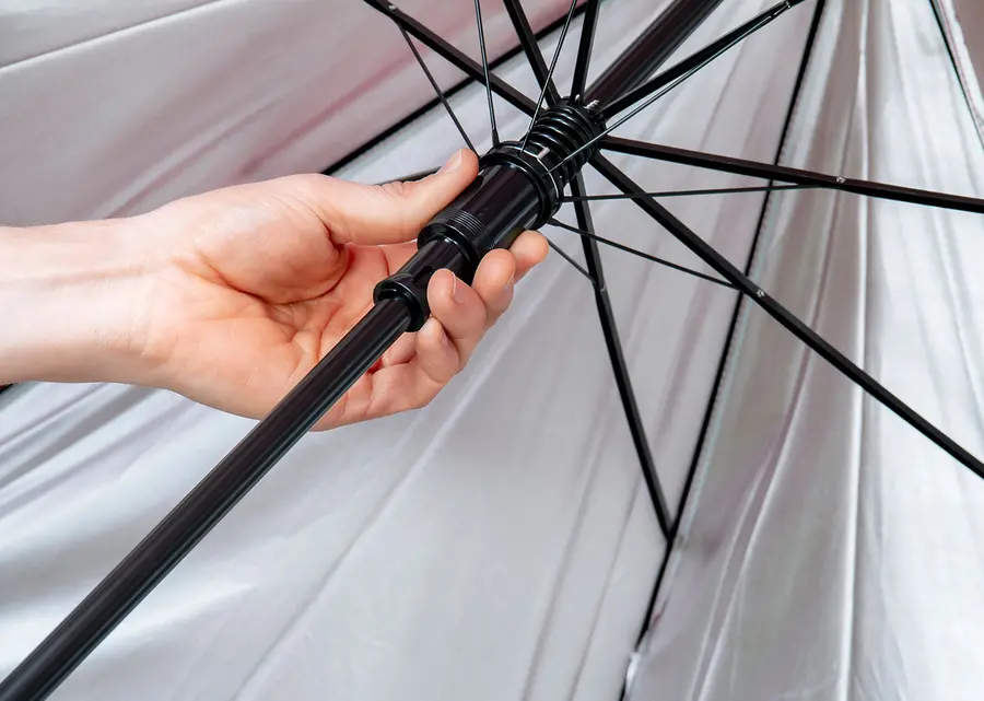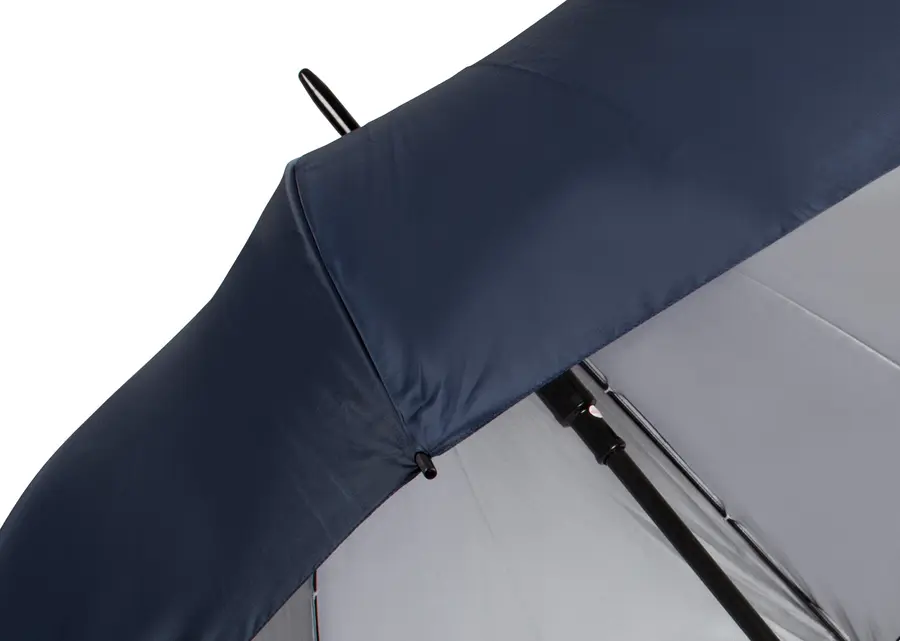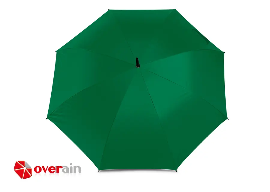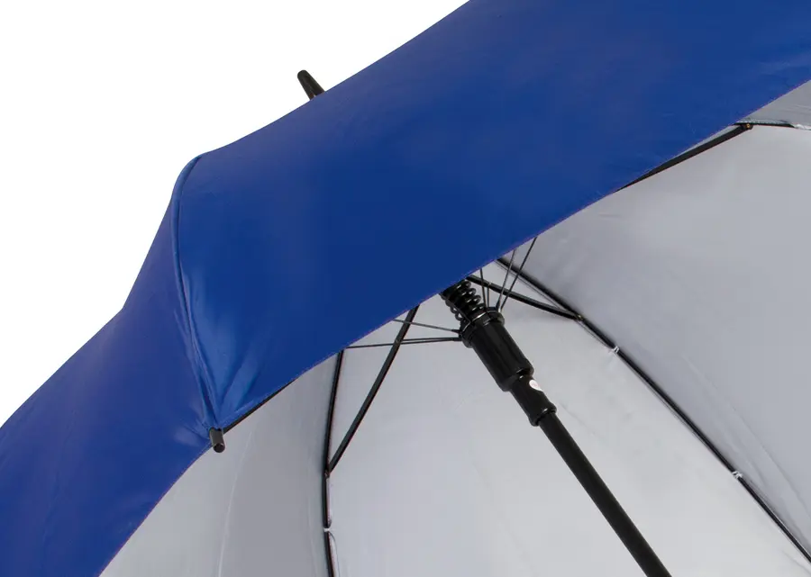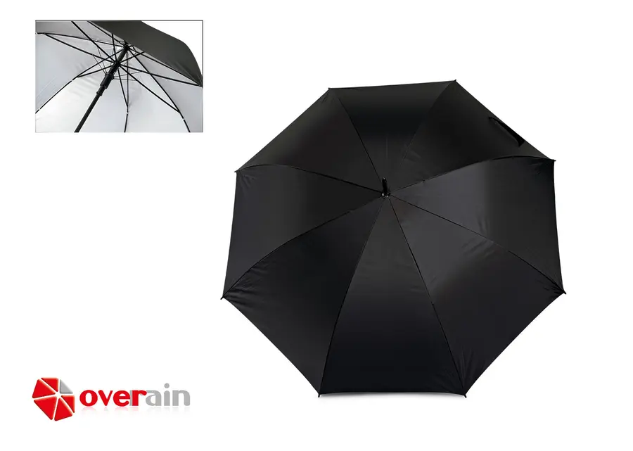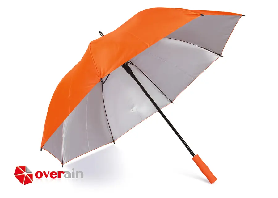 Paraguas tipo Golf con doble recubrimiento interior plateado. Apertura automática y cierre manual. Mango recto del mismo color de la tela.