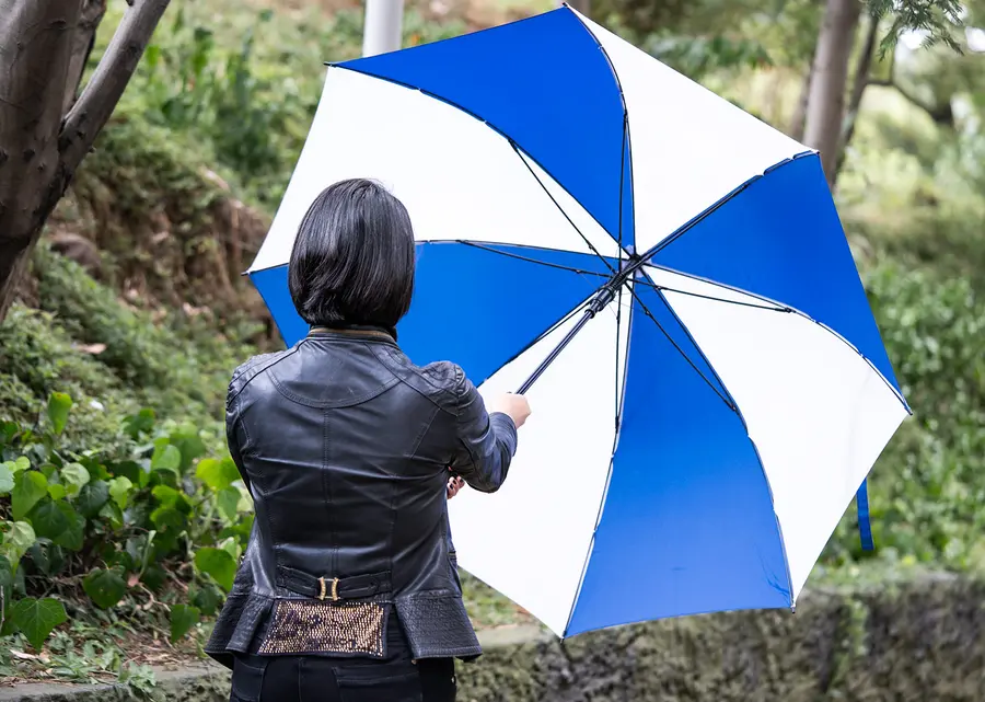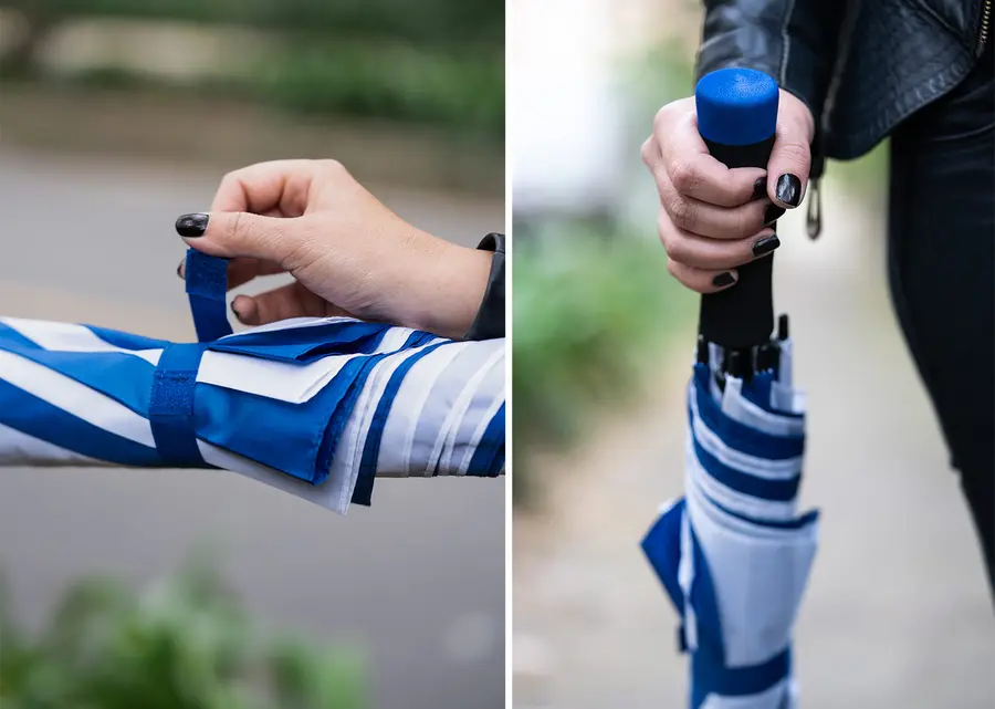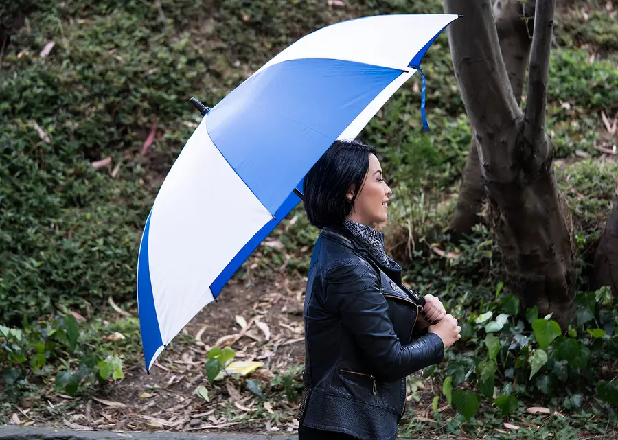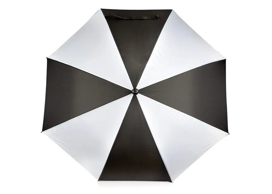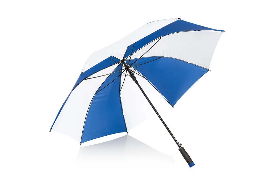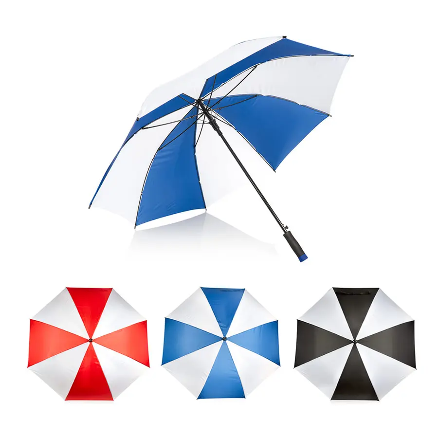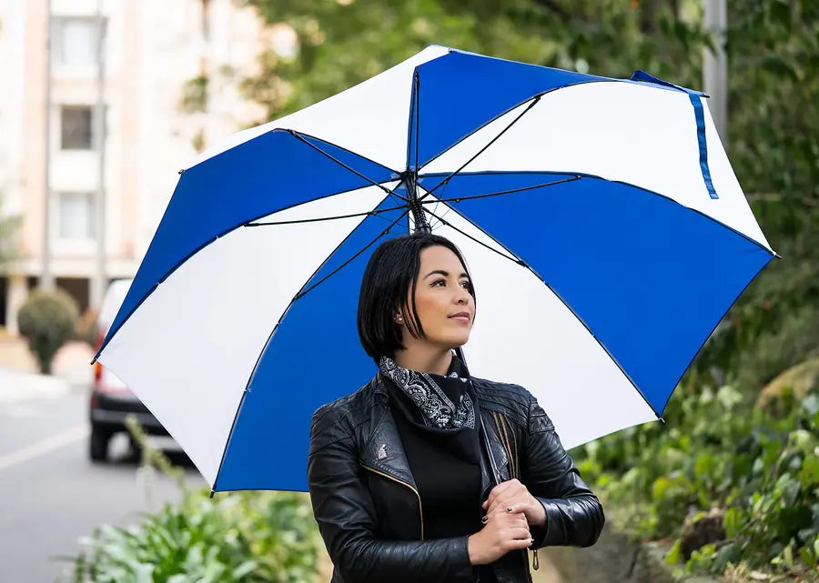 Paraguas tipo Golf con tela combinada en dos colores, su apertura es automática y su cierre, manual. Mango recto negro con borde del mismo color de la tela.