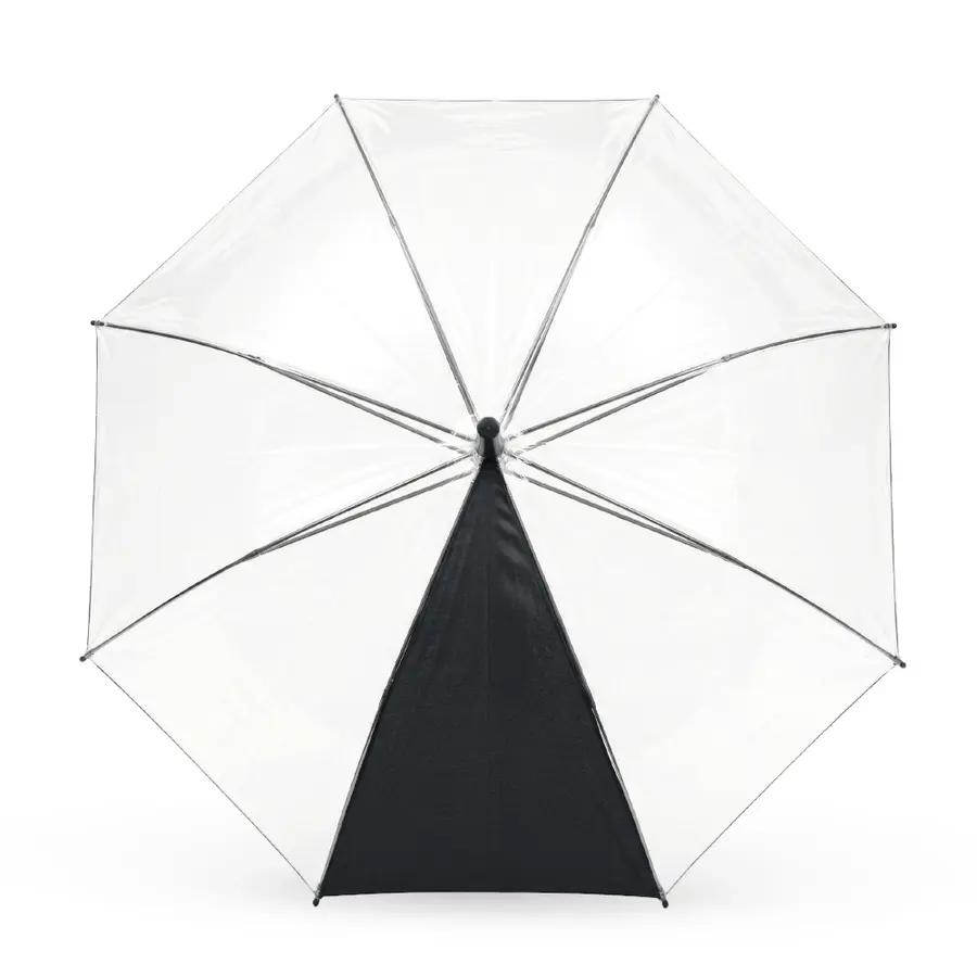 Un panel en poliéster pongee y siete paneles en plástico POE. Paraguas con mayor cobertura y visibilidad al caminar. Apertura y cierre manual. Mango curvo en caucho y herraje metálico con fibra de vidrio.