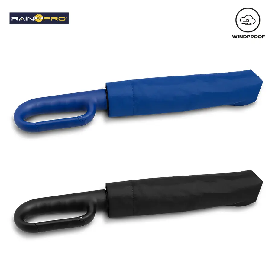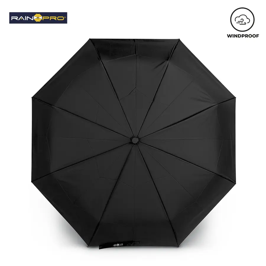 Paraguas plegable de alta calidad en poliéster Pongee 190T. Resistente al viento.Con herraje en aluminio y varillas en fibra de vidrio. Apertura y cierre automático con botón. 8 cascos. Mango tipo carabinero en plástico para poderlo colgar. Incluye funda.