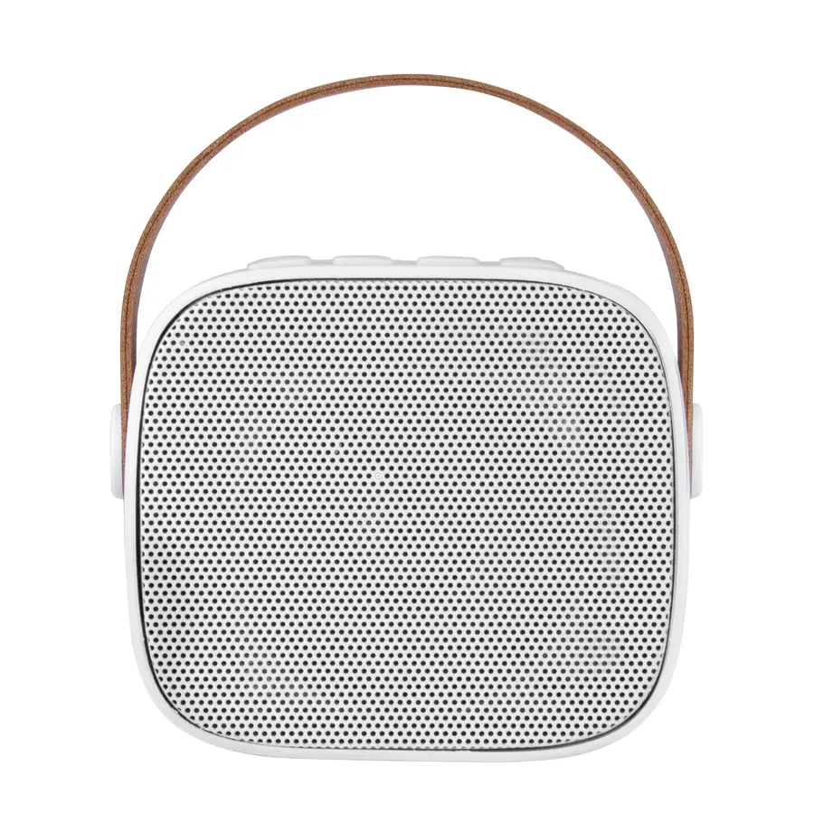 Potencia tu sonido en cualquier lugarParlante Bluetooth estéreo con tarjeta TF y entrada AUX. Estructura plástica color blanco y asa en poliuretano color marrón. Cable de carga y conexión USB-C en color blanco. Incluye manual de uso.Medidas: 8,5 x 6,5 x 7,3 cm. Materiales: Plástico y Poliuretano. Potencia: 5 W. Capacidad de la batería: 1200 mAh. Presentación: en caja de regalo kraft