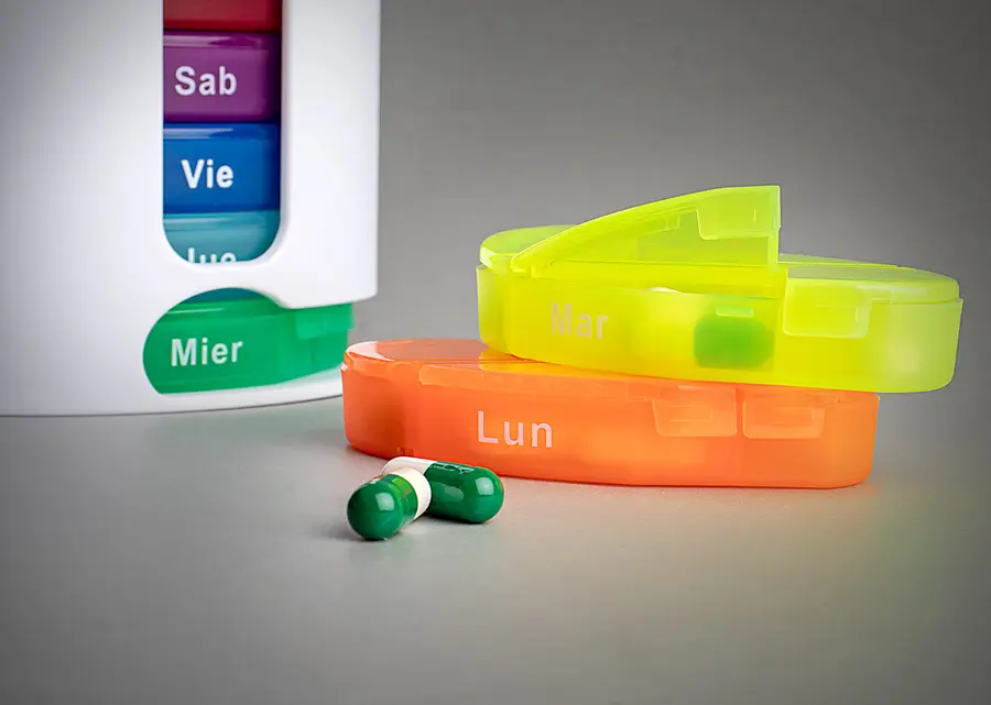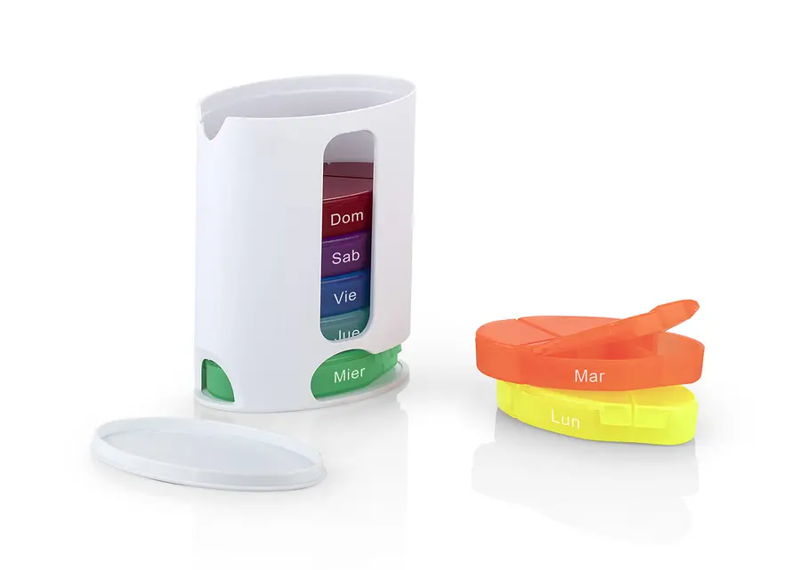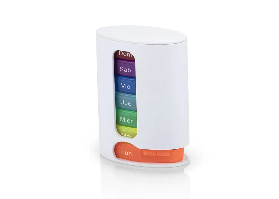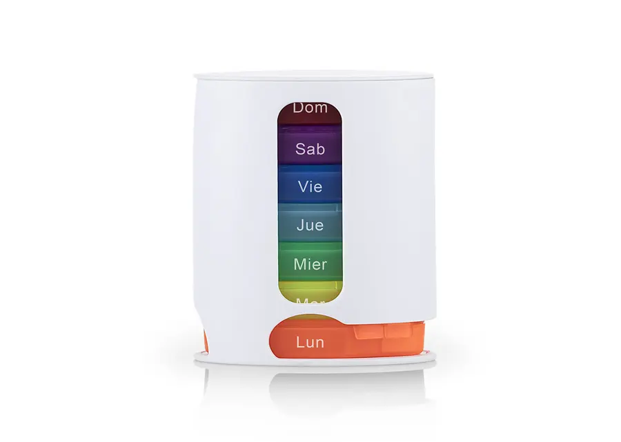Pastillero semanal de colores con 7 compartimientos asignados para cada día de la semana. Cierre a presión.