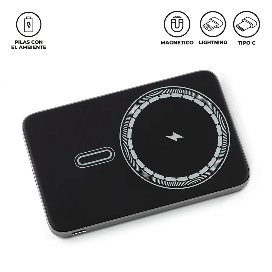 Pila recargable en aluminio de 5000 mAh. Con imán para carga inalámbrica y display de carga. Un puerto Tipo C para carga. Empaque caja individual.