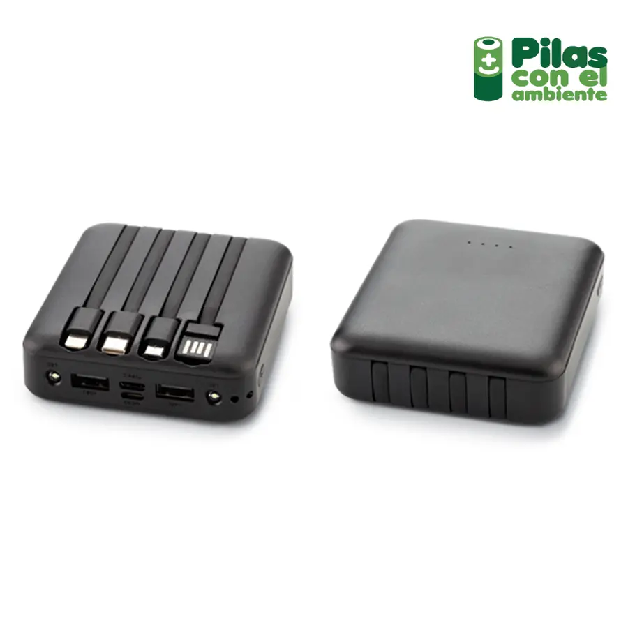 Pila recargable de emergencia de 5000 mAh con luz led. Cables con conectores lightning, Micro, USB y Tipo C, con alimentación de energía mediante puerto USB, Tipo C, Micro. 4 luces indicadoras del estado de carga.