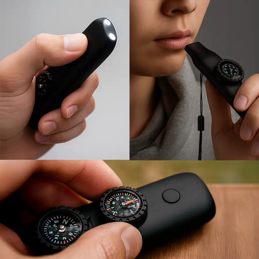 Pito plástico 5 en 1. Con brújula, termómetro, lupa