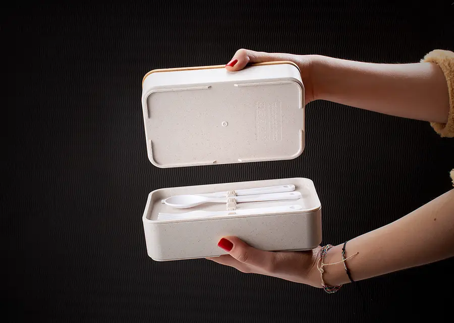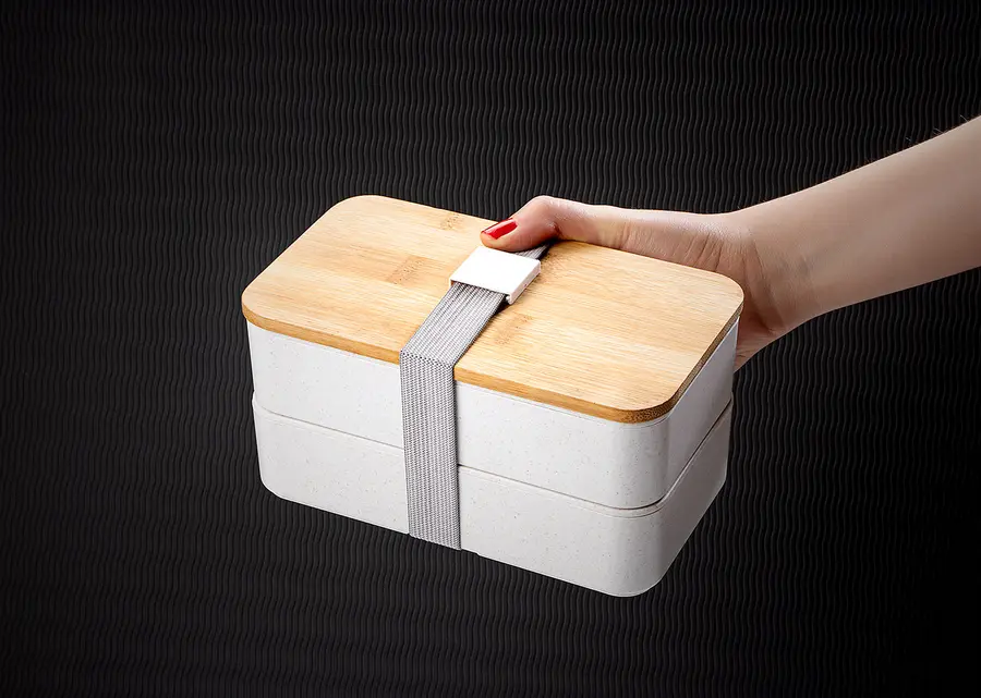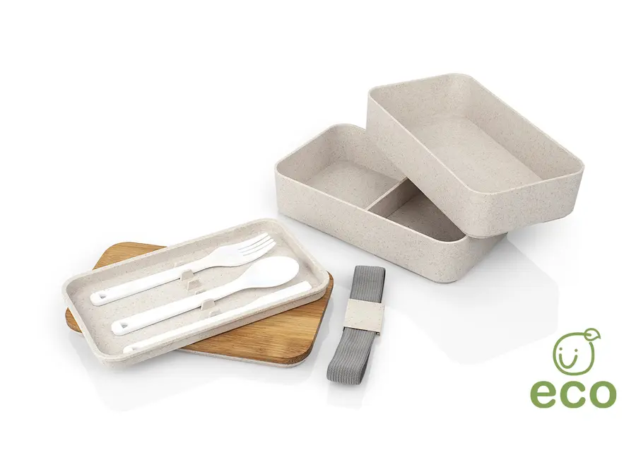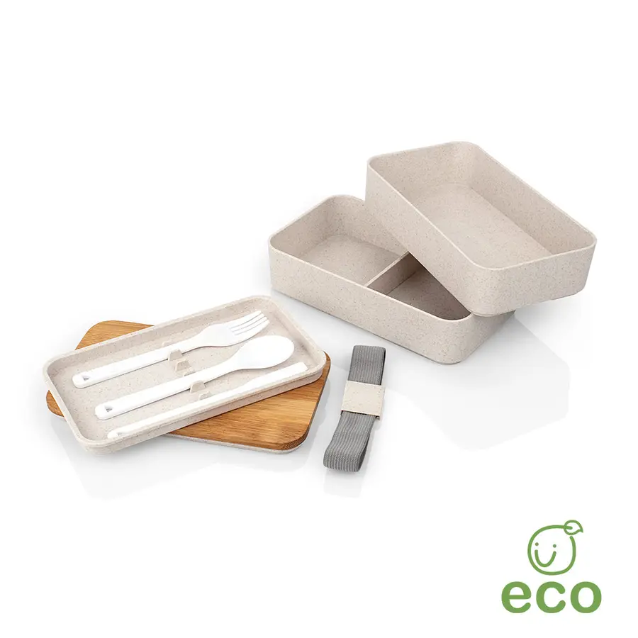 Portacomidas de dos secciones paja de trigo con tapa en bambú y banda en silicona, incluye tenedor, cuchara y cuchillo
