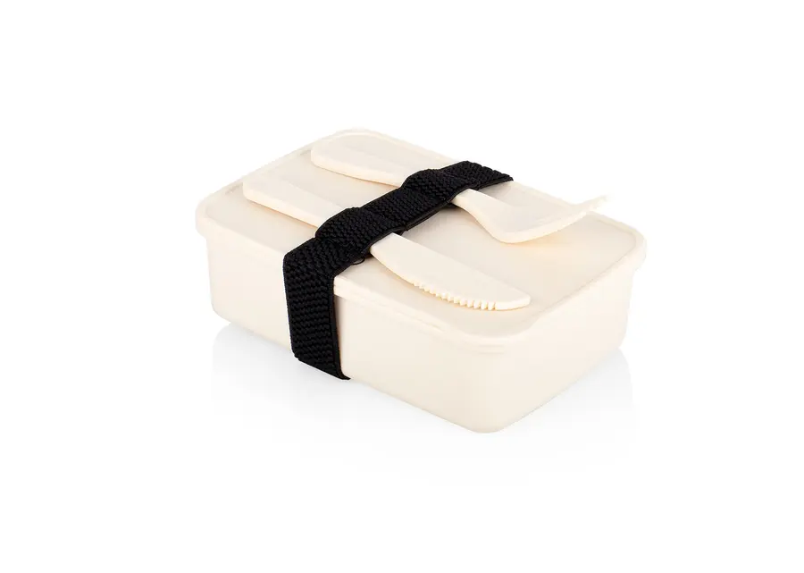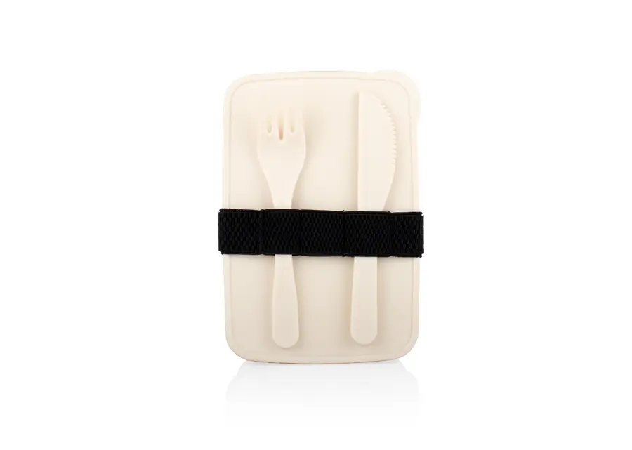 Portacomidas rectangular con banda de seguridad negra. Incluye cuchillo y tenedor.